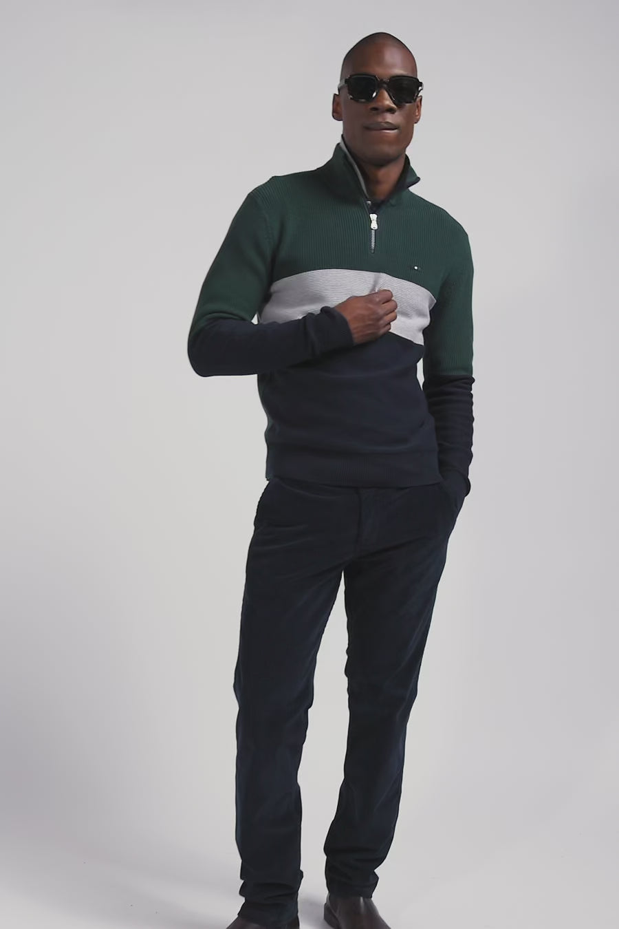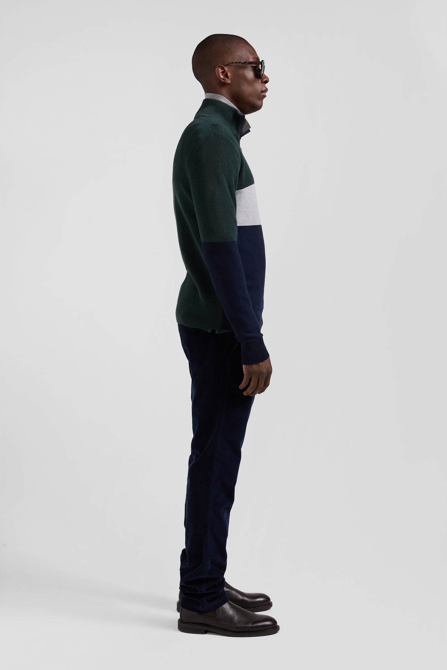 This zip-up stand-up collar sweater reveals meticulous finishes like its elegant vertical stripes on the inside, its jersey half-moon and the tricolored knit detail that enrich its interior with distinction. Alternating pearl ribbing, reverse jersey and Ottoman stitch create a subtle contrast, offering a versatile piece in three timeless shades for everyday style.