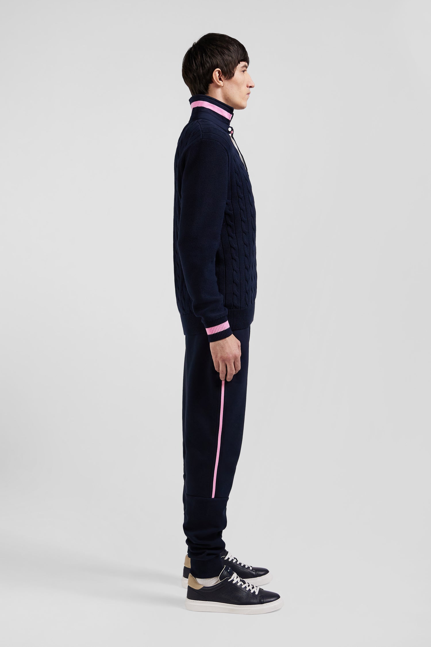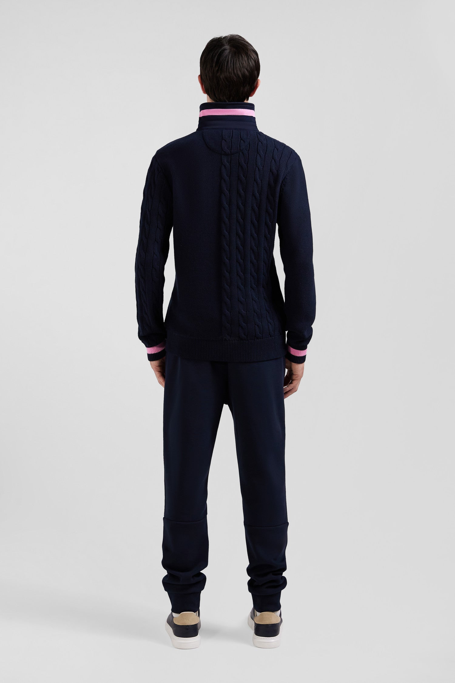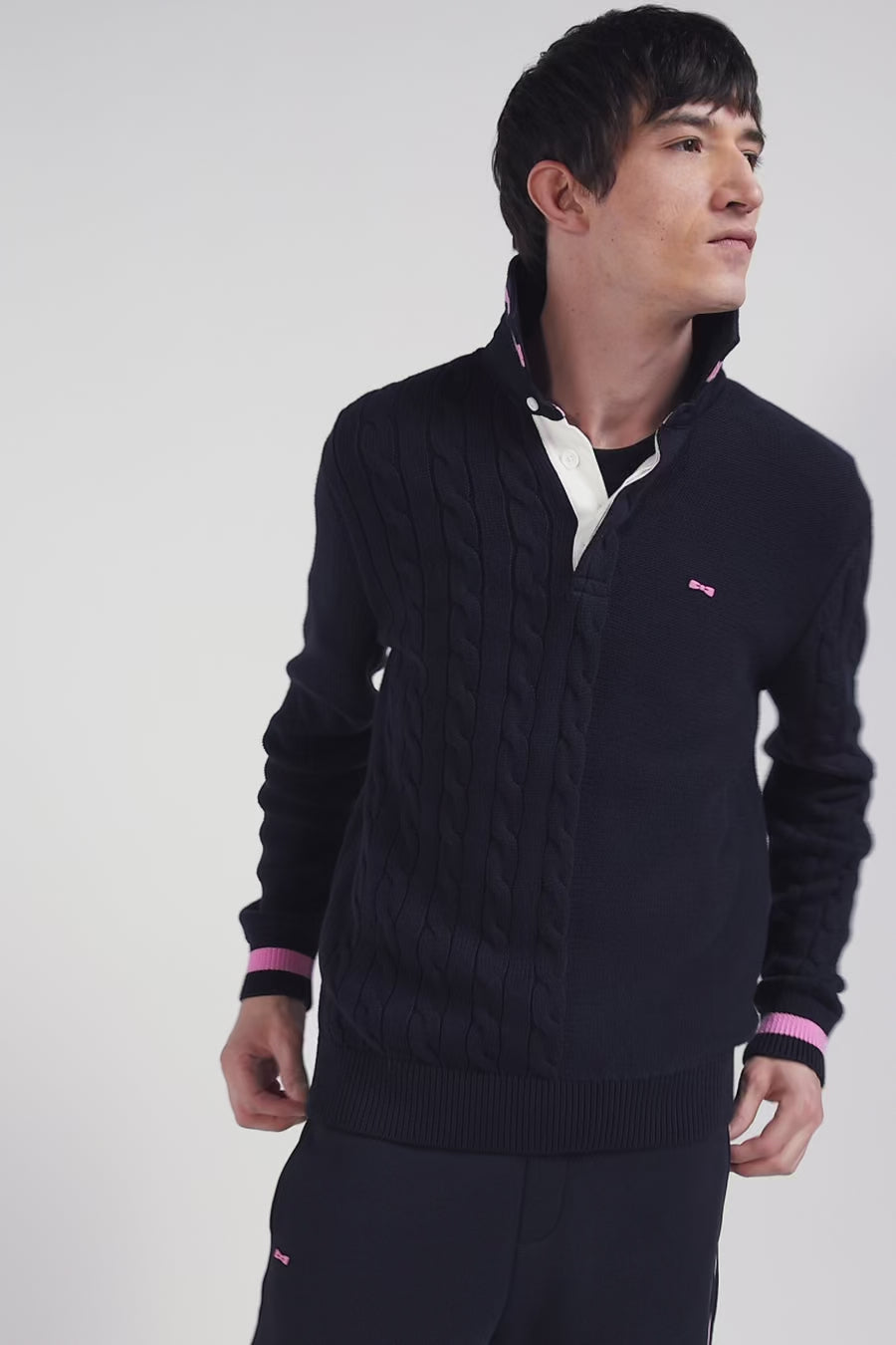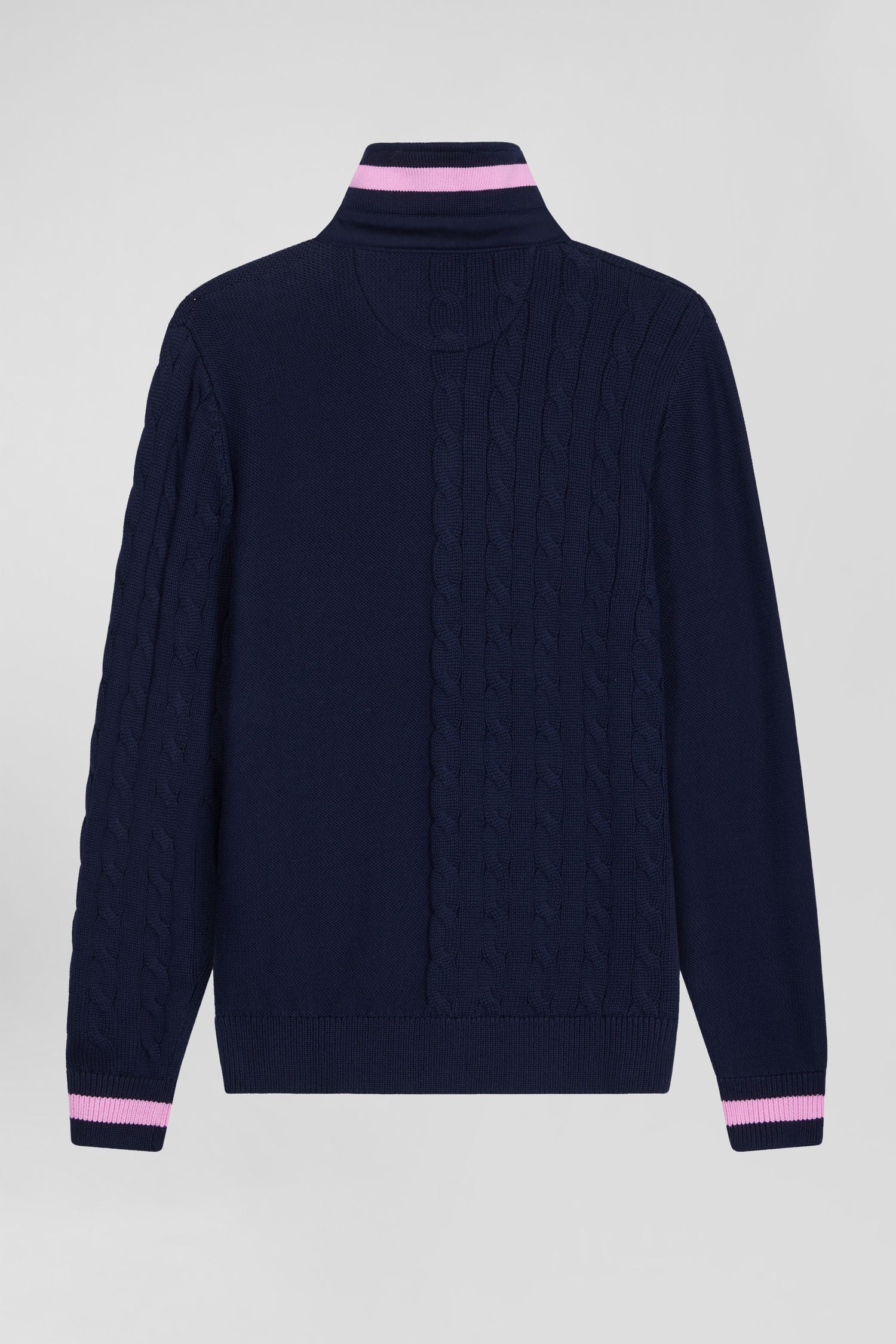 Opt for the casual elegance of this men's jersey-neck sweater in twill. Under its collar, knitted stripes reveal a touch of distinction, while the twisted knit assembled for a contrasting effect to its soft knit lends a deep, rich texture to this men's pullover. Striped cuffs add a bold contrast, for a look that's as timeless as it is modern.