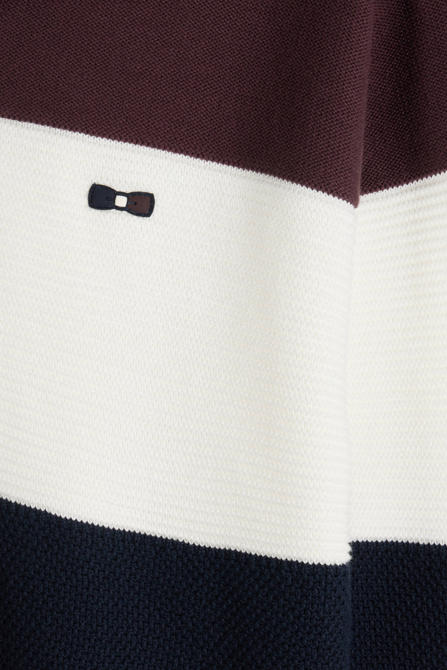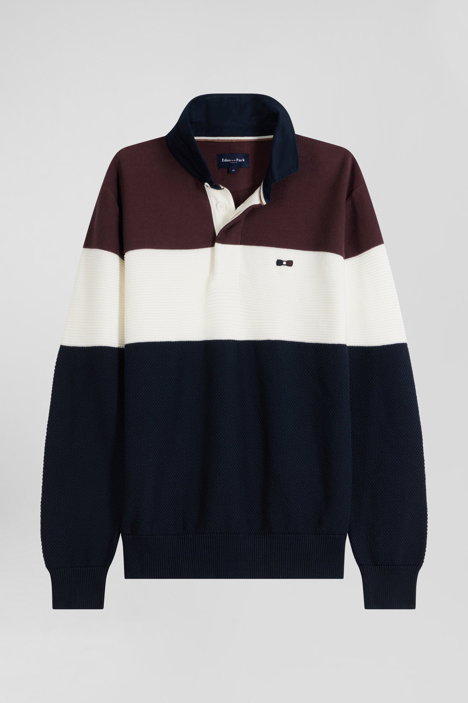 This sweater with twill jersey collar displays subtle sophistication with its contrasting interior stripes. Its jersey half-moon and tricolored ribbon knit enrich the interior, while the alternating textures created by the varied knitting (purl jersey stitches, Ottoman stitches and piqué) offer a captivating visual effect, combining style and comfort while drawing inspiration from our mythical rugby jerseys thanks to a cut and sewn assembly.