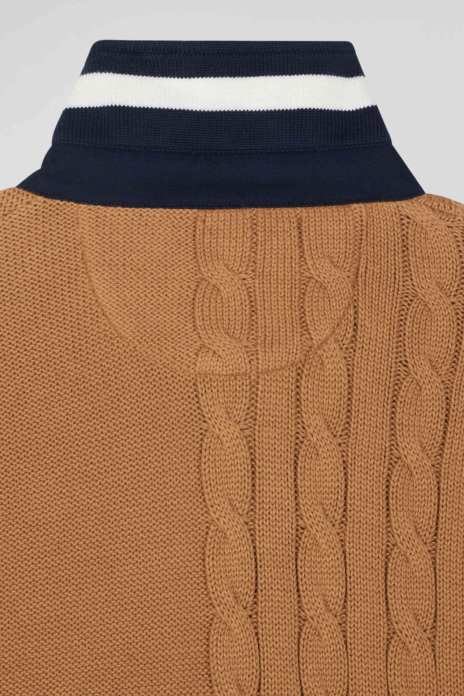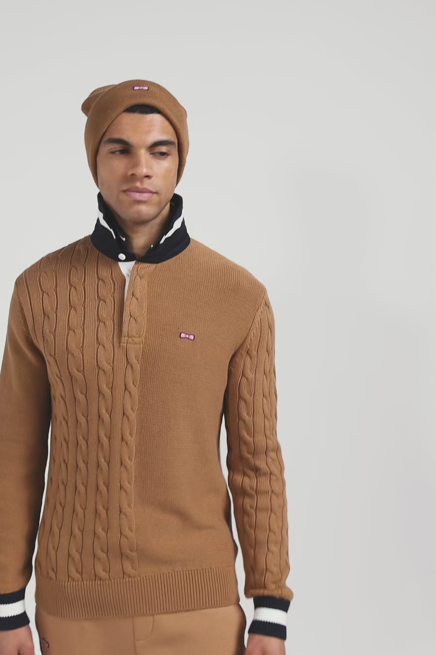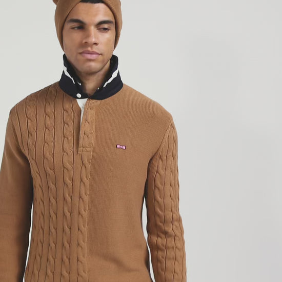 Opt for the casual elegance of this men's jersey-neck sweater in twill. Under its collar, knitted stripes reveal a touch of distinction, while the twisted knit assembled for a contrasting effect to its soft knit lends a deep, rich texture to this men's pullover. Striped trim on the cuffs adds bold contrast, for a look that's as timeless as it is modern.