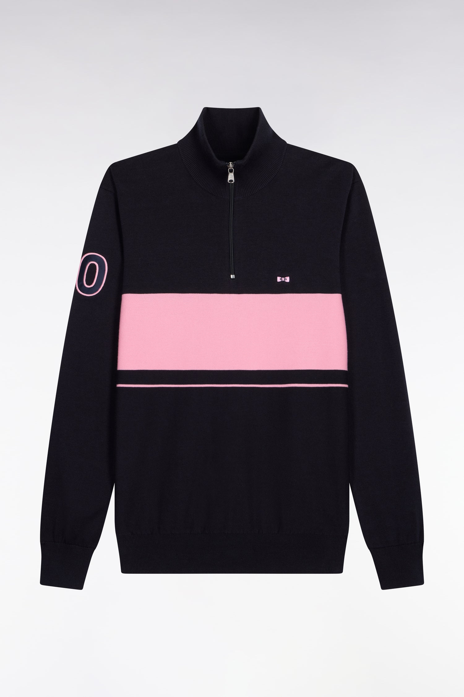 Ce pull à col camionneur revisite un classique du vestiaire masculin avec un jeu subtil de textures et de contrastes. Son tricotage mêle points jersey, envers et Ottoman pour une allure dynamique et contemporaine. L’ouverture zippée frontale et le patch 10 brodé sur la manche rappellent l’héritage rugby de la Maison, tandis que la broderie du nœud papillon sur la poitrine signe cette pièce emblématique de l'esprit French Flair de nos collections de mode.