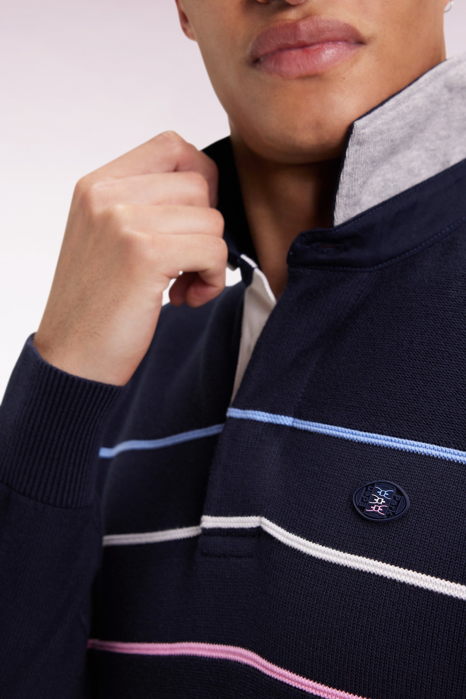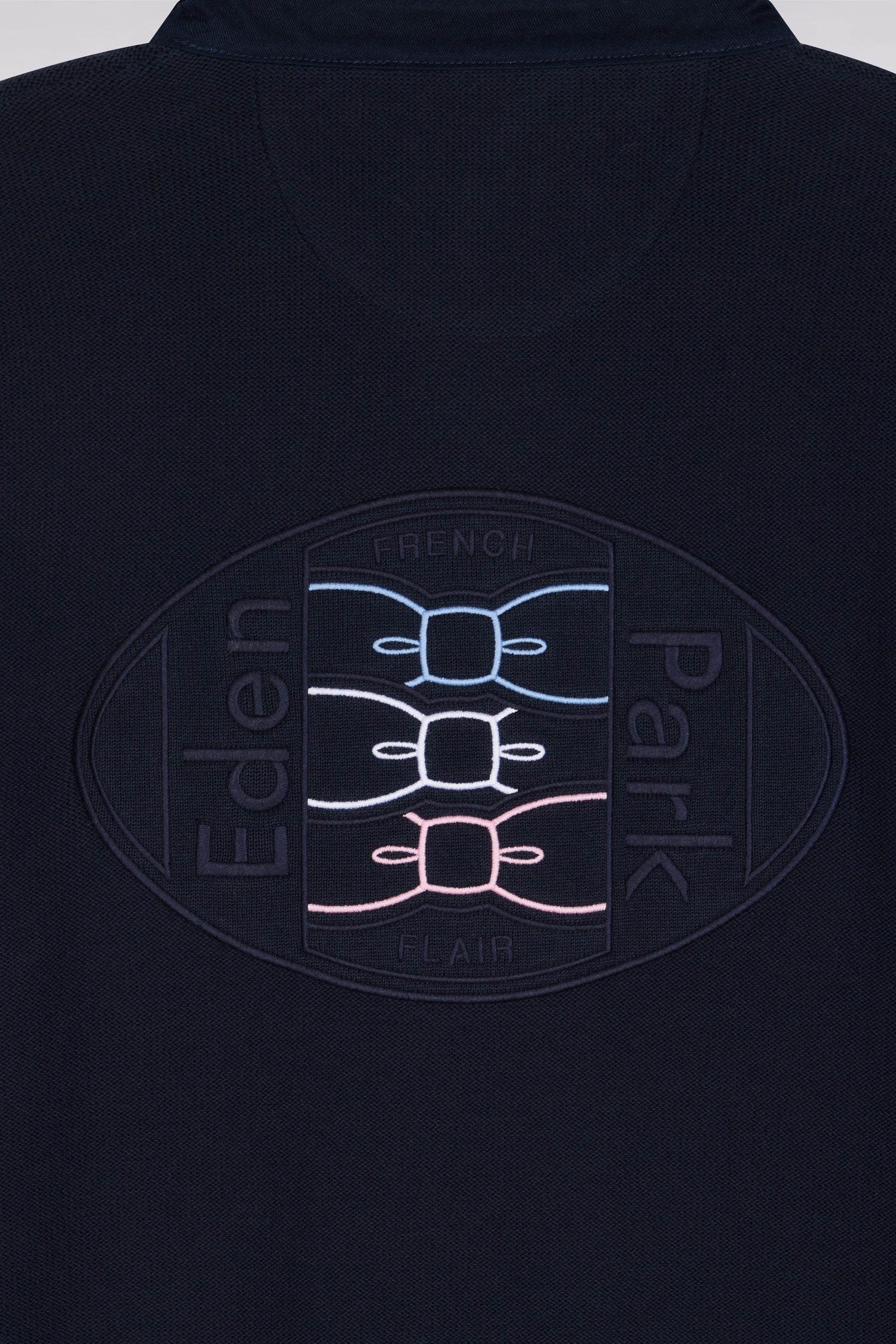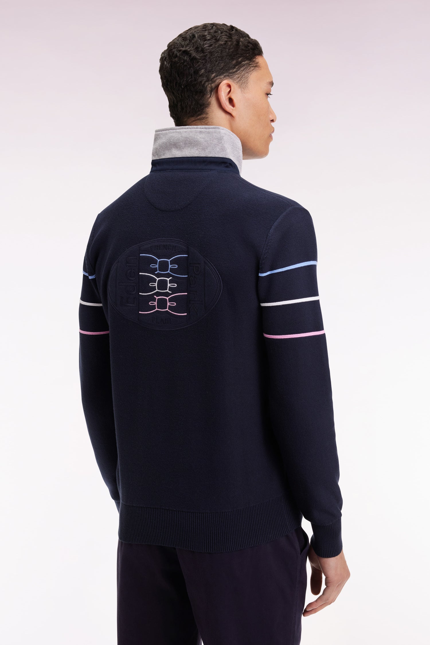 Inspired by the rugby wardrobe, this men's cotton jersey-neck sweater features careful construction and graphic details. The underside of the collar is knitted in contrast, a visible detail when worn open. The collar also features a twill structure for impeccable fit. The tricolor piping connected between the chest and sleeves, the felt and silicone badge on the chest and the large oval embroidery on the back are the hallmarks of this strong piece, with its assertive sport-chic spirit.