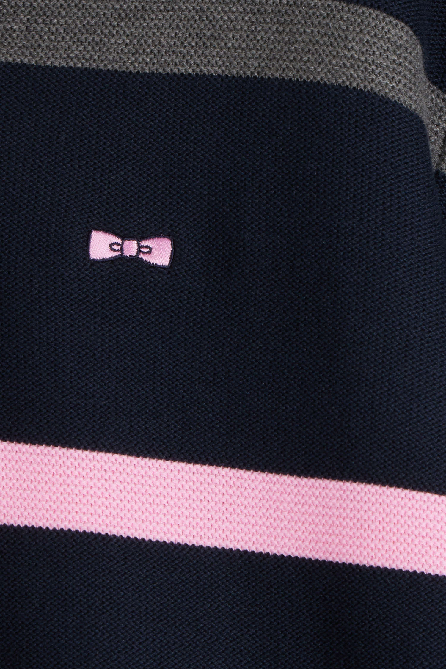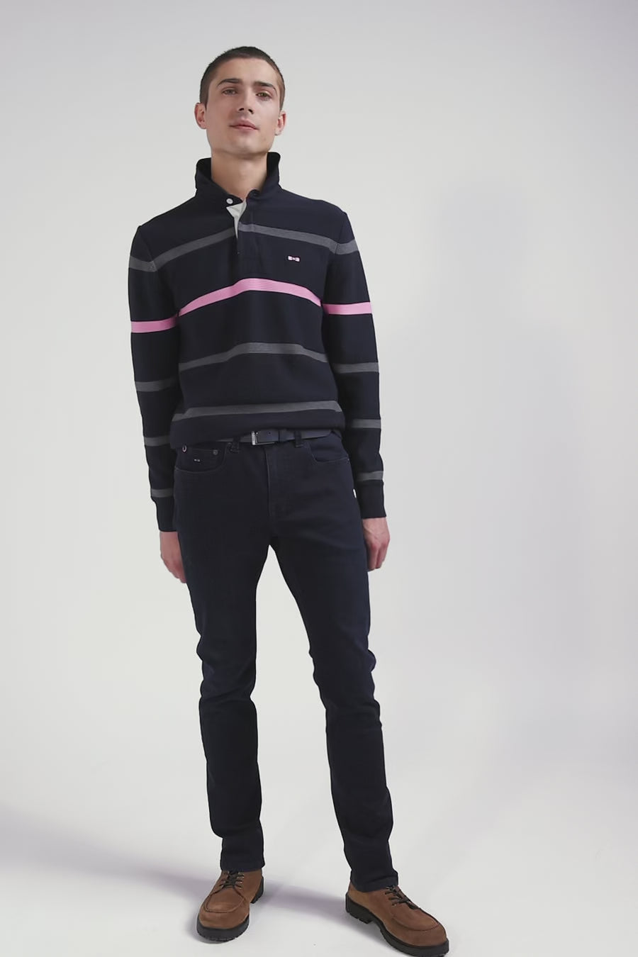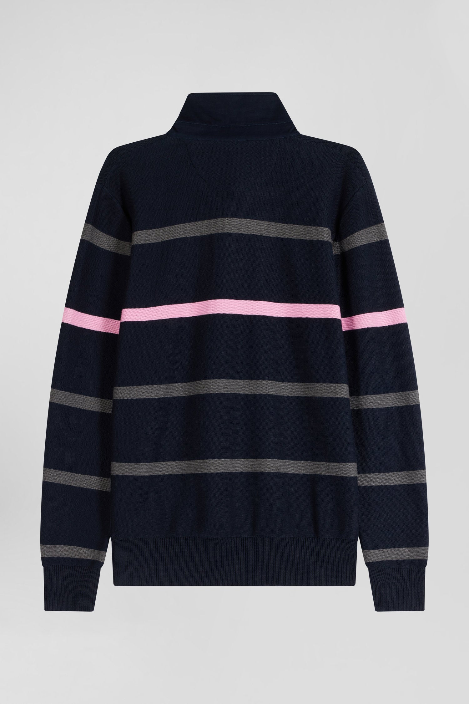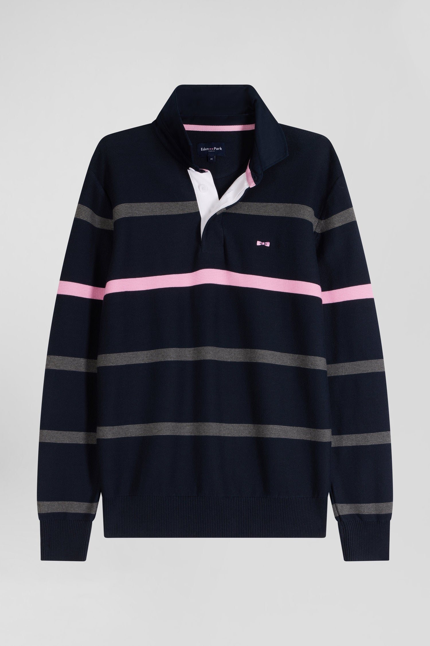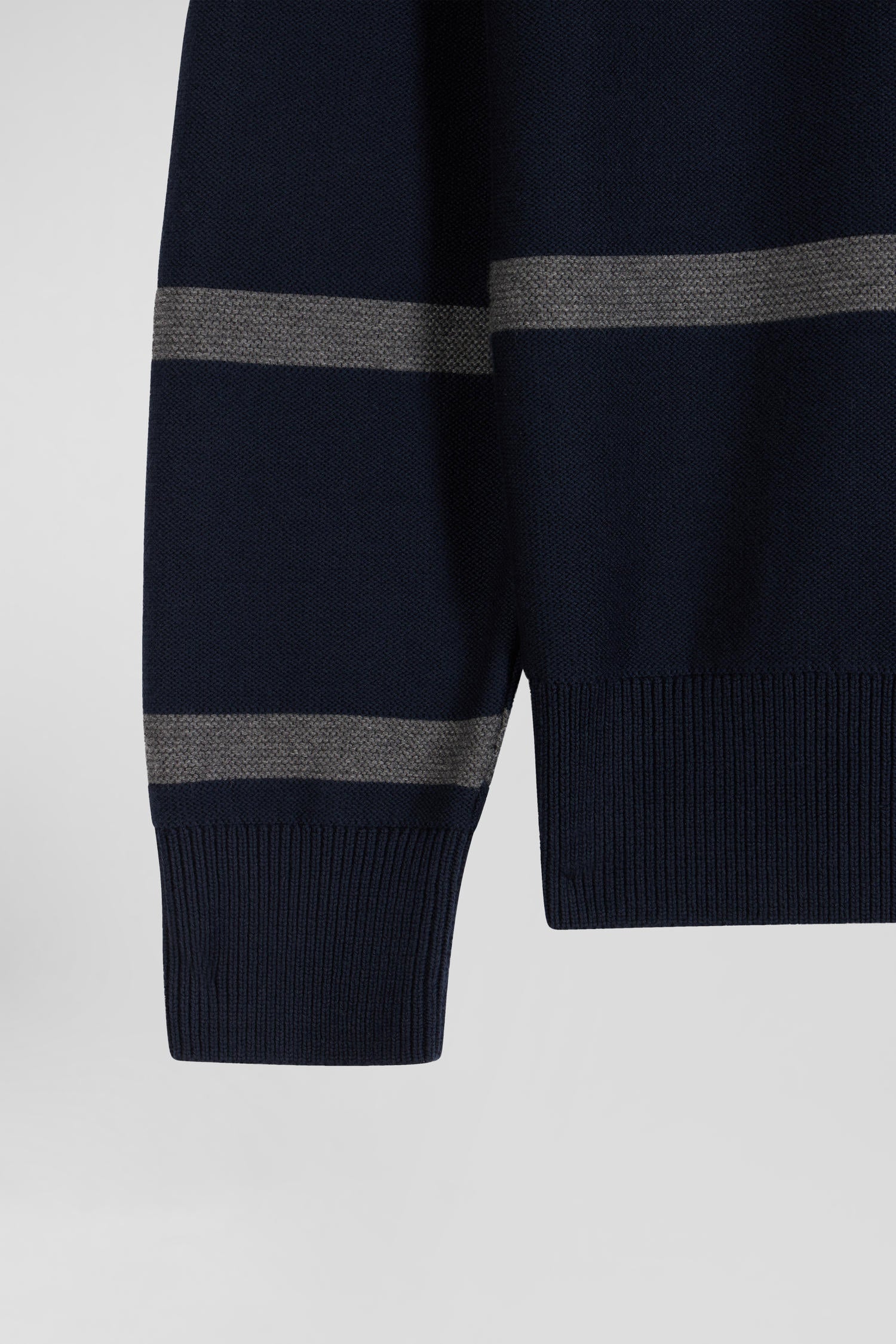 This men's jersey-neck sweater in cotton twill is a highlight of the season. It features a herringbone-weave neckband and contrasting Ottoman-stitch stripes. The reverse jersey-stitch body and sleeves are highlighted by a wide contrasting stripe across the chest for a bold look typical of Eden Park's French Flair spirit.