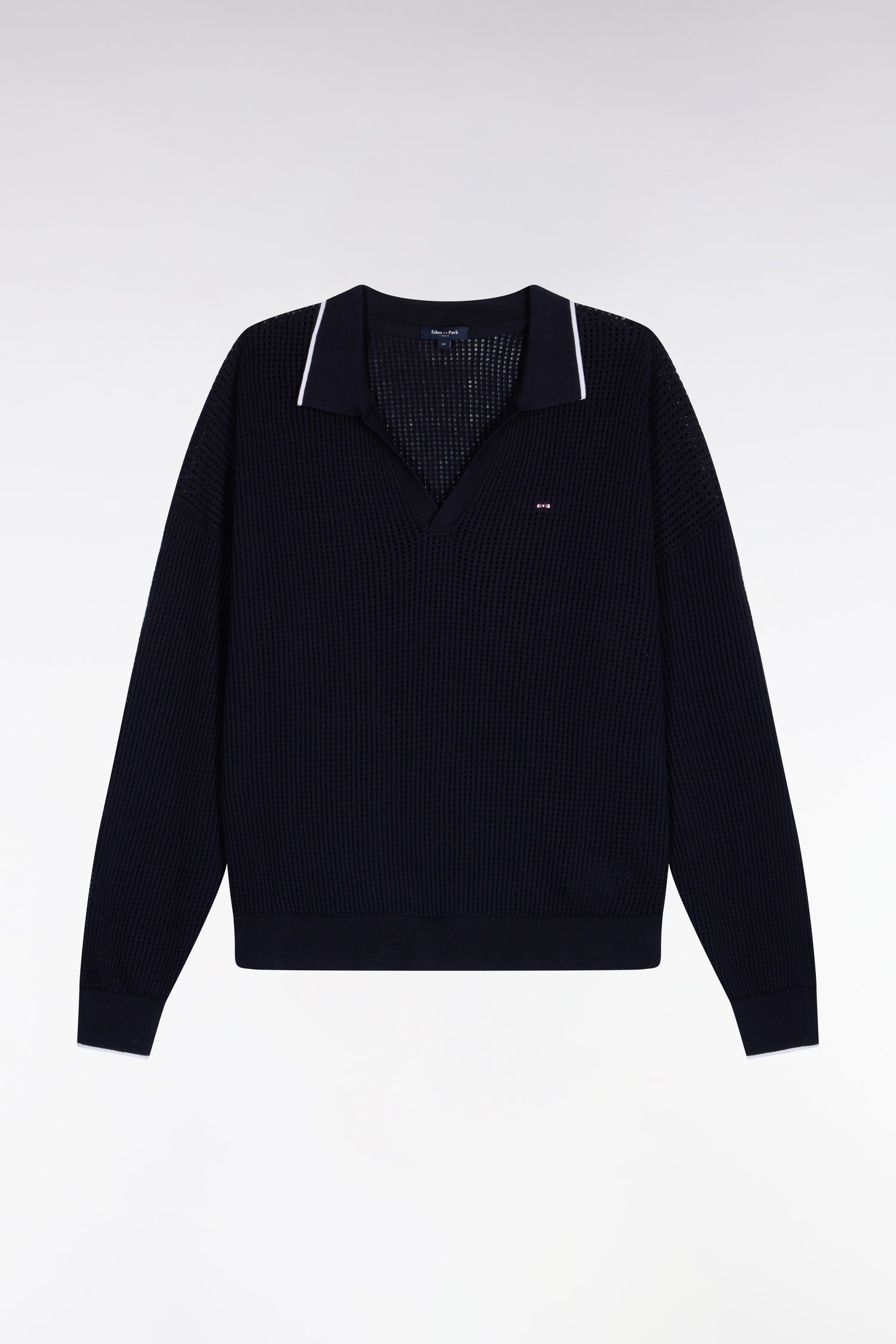 Notre pull col polo à manches longues, proposé en marine ou en blanc, se distingue par sa maille mesh légère qui apporte fraîcheur, relief et modernité. Son caractère est rehaussé par un liseré contrasté au col et aux poignets, ainsi que par le nœud papillon brodé sur la poitrine, emblème de notre Maison. À porter avec un jean clair, un pantalon large ou un short d’été pour une silhouette élégante et effortless quoi que vous réserve le moment.