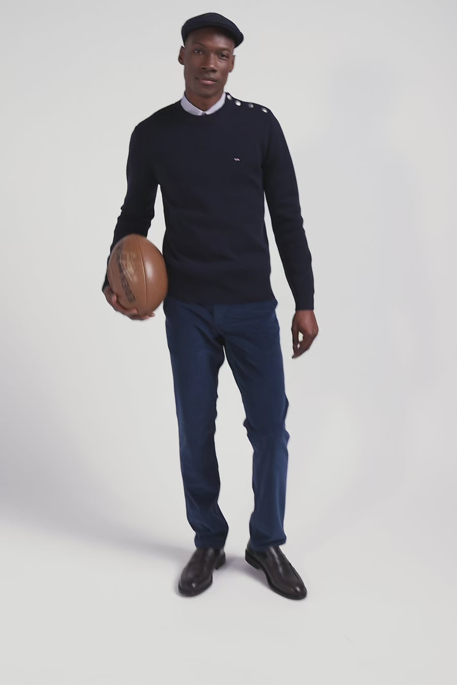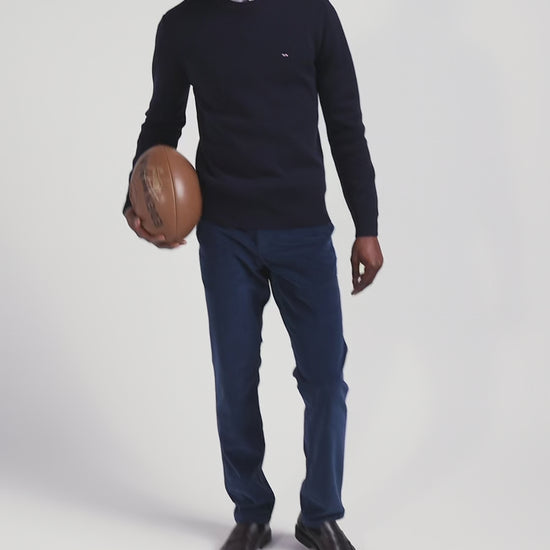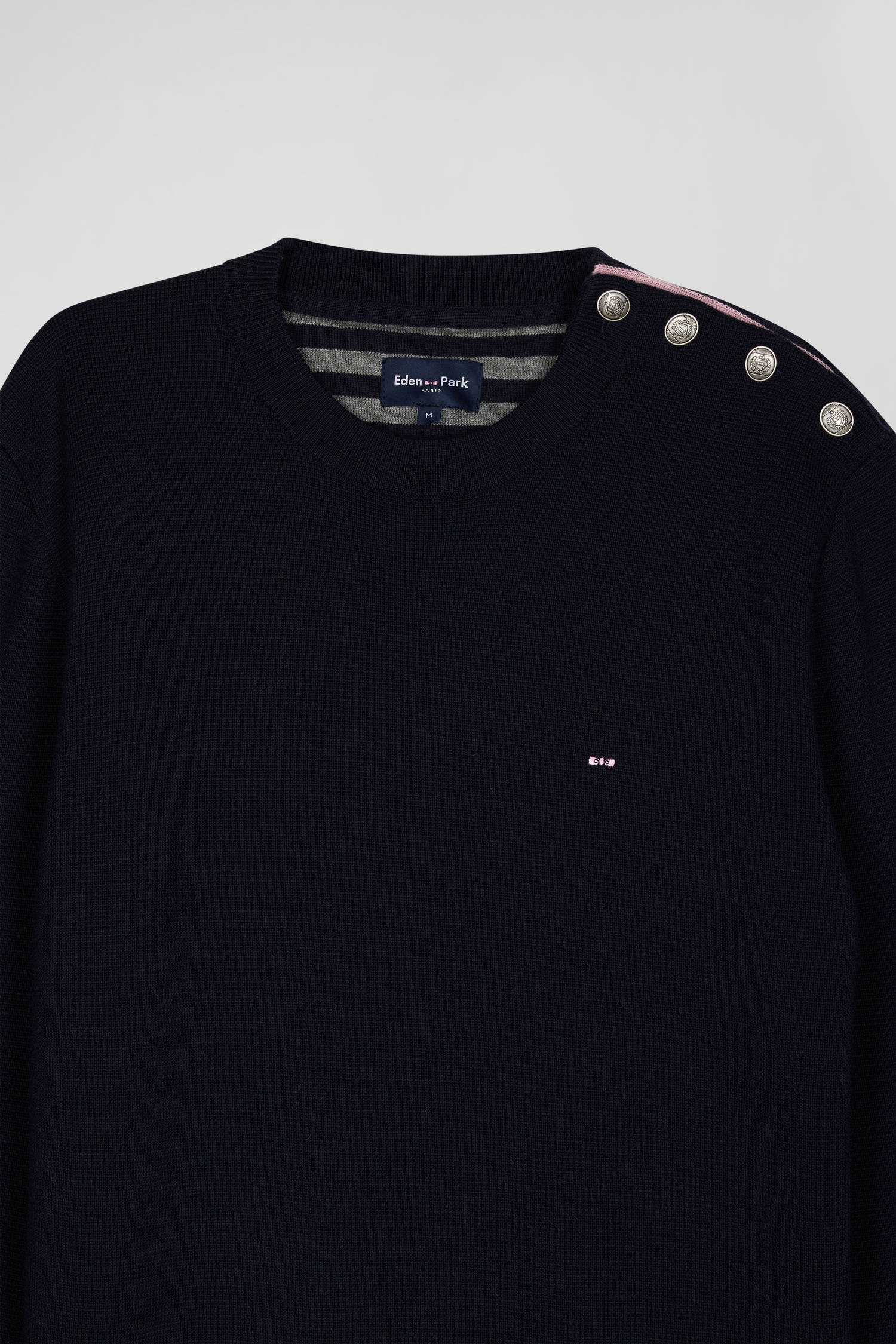 Regular navy blue crew neck jumper with shoulder buttons