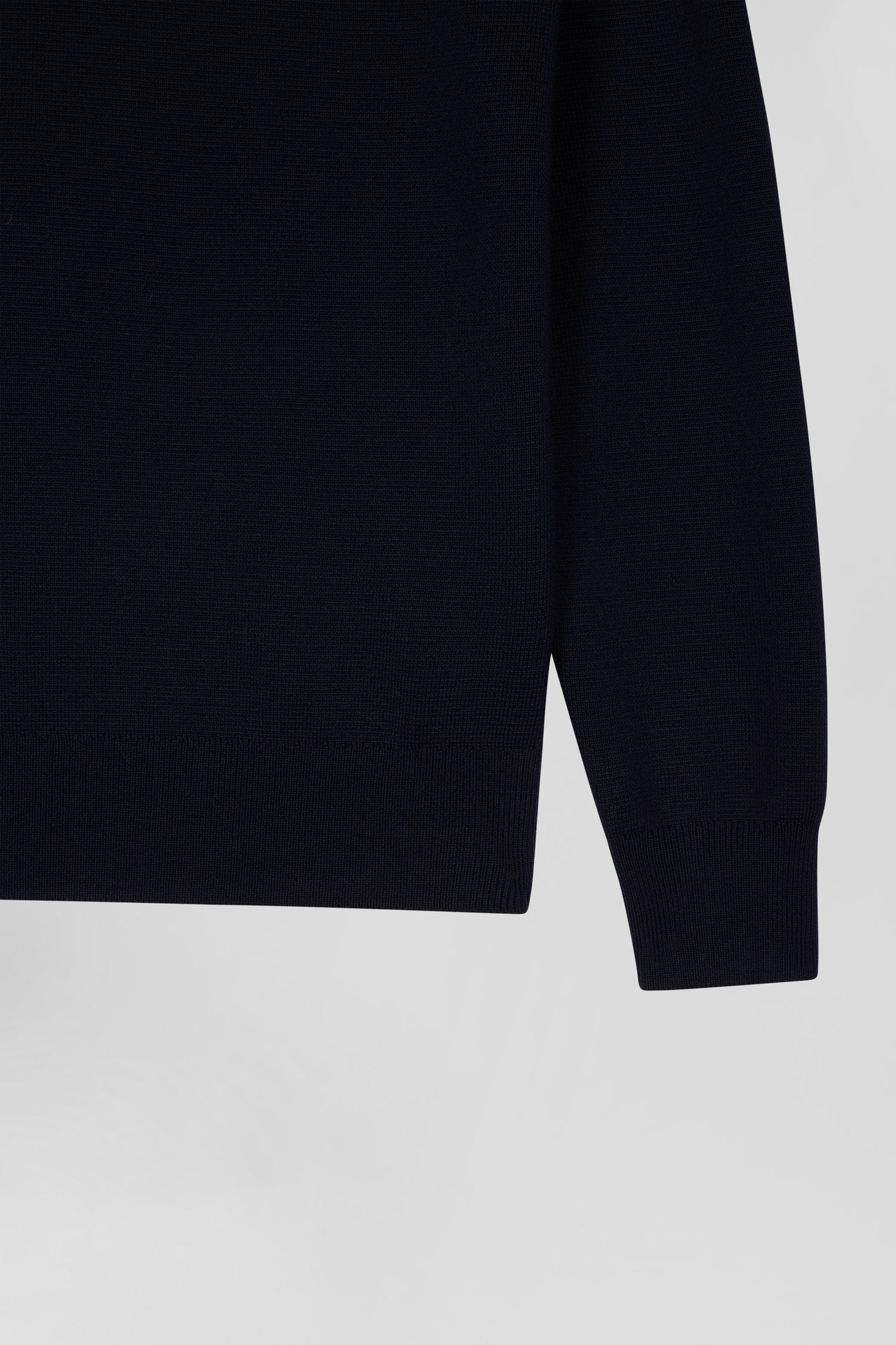 Crafted in soft, comfortable wool, this navy blue men's sweater features a round collar with a button placket and gold buttons on the shoulder. Timeless and versatile, this navy wool sweater features our signature pink bow-tie embroidery on the chest.