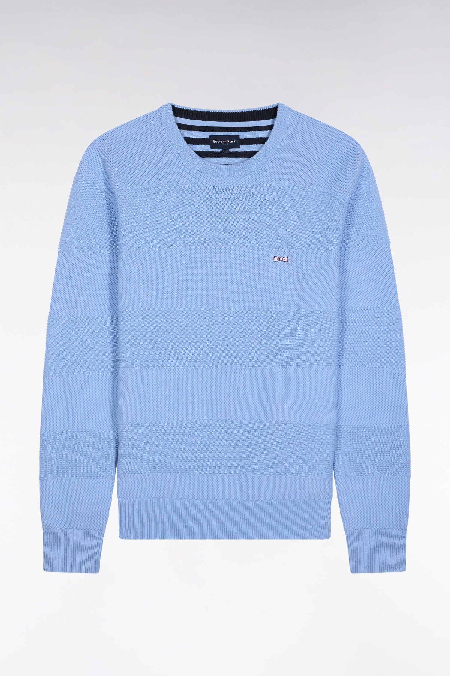 With its alternating ribbed stitch and honeycomb knit, this men's round-neck sweater in pure cotton revisits rugby stripes in a subtly textured version that pays tribute to the expertise of the company's workshops. The straight cut, bow-tie embroidery and meticulous finishing touches, such as the striped half-moon, make it an Eden Park wardrobe essential: a chic, timeless synthesis of our sporting heritage and our French Flair sense of masculine elegance. This model is available in 4 colors