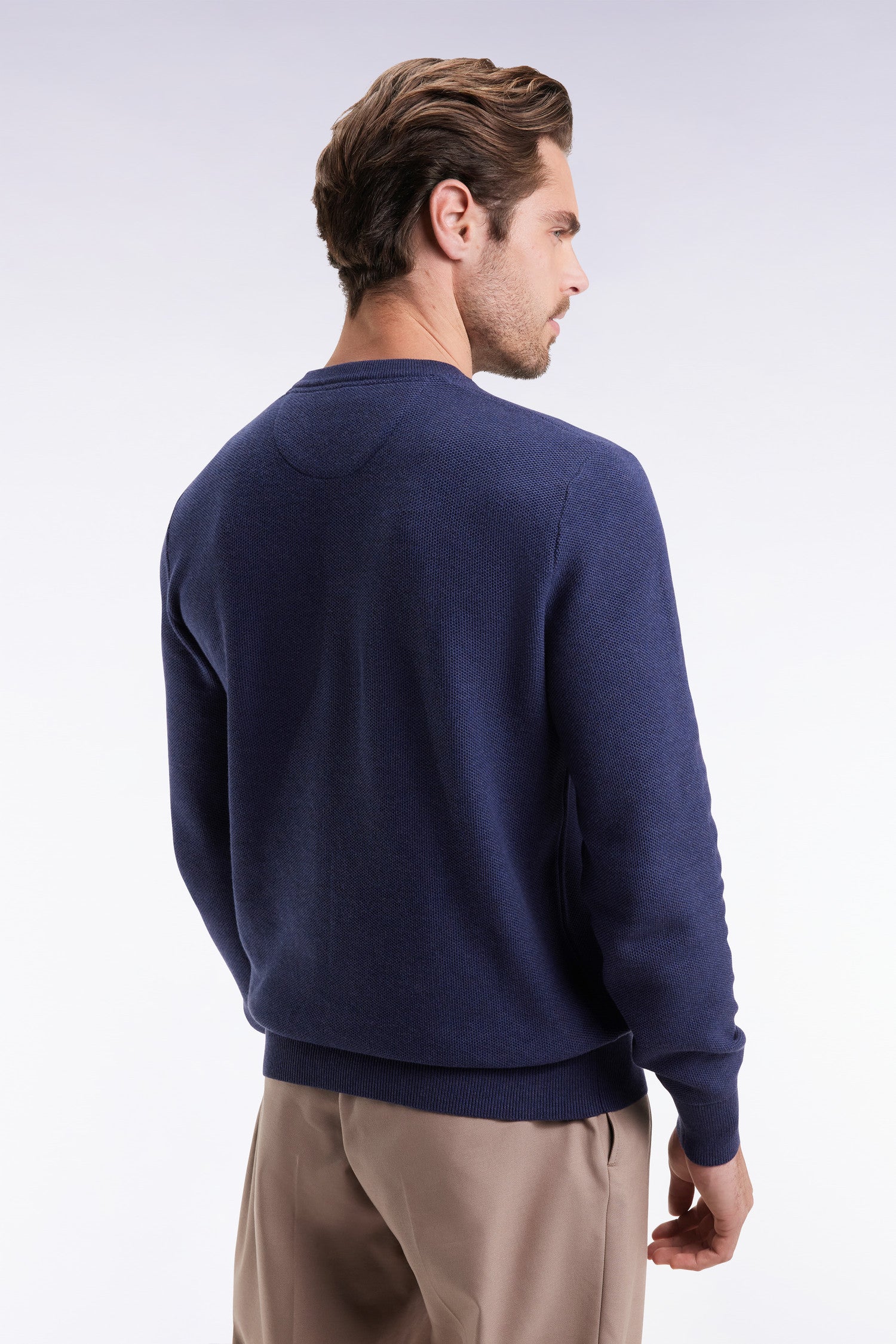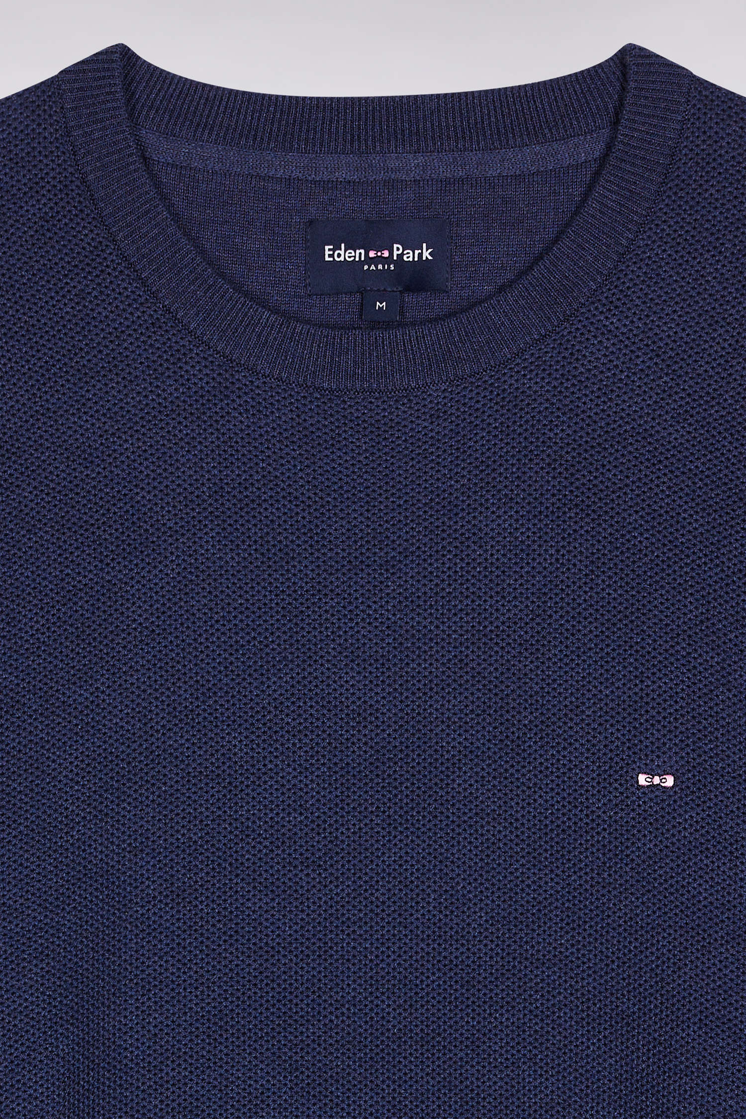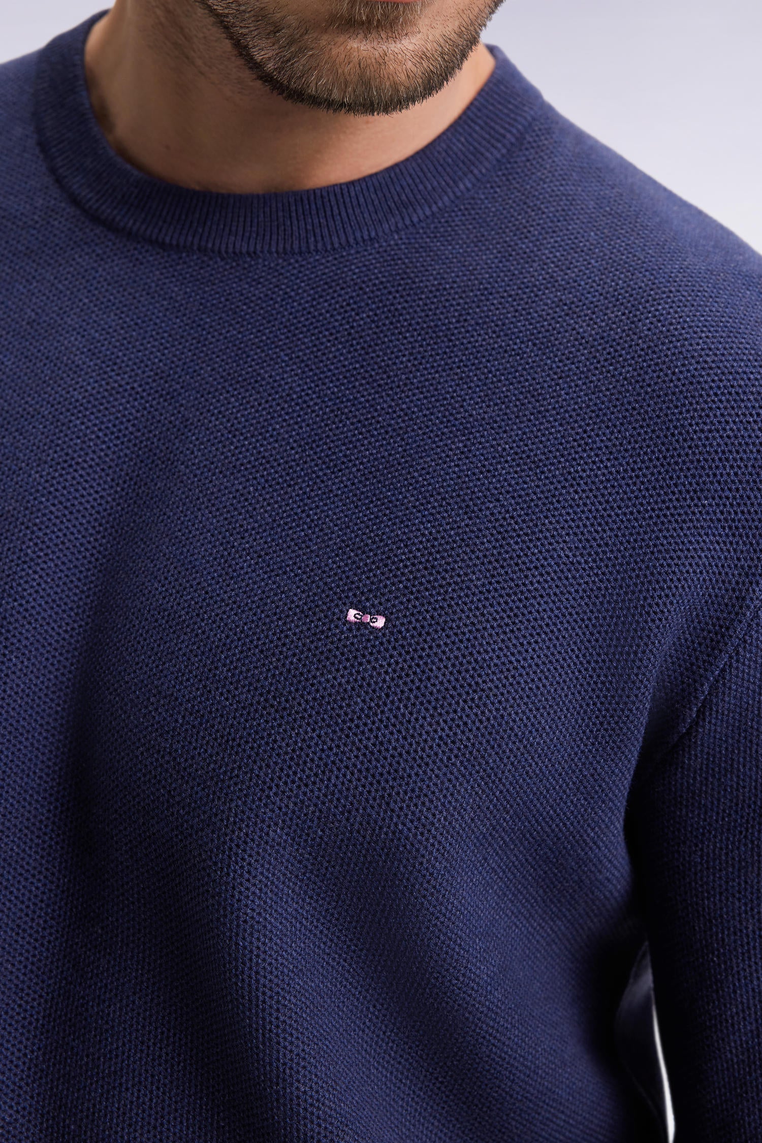 A slightly irregular texture and a chic-casual spirit perfectly describe this round-neck sweater in honeycomb cotton. Its straight cut and bow-tie embroidery on the chest give it a neat look without overdoing it, true to Eden Park DNA. The ribbed collar and sleeve cuffs contrast neatly with the slightly more whimsical honeycomb knit. An easy-going piece, ideal for seasonal layering. This masculine round-neck sweater is part of a complete wardrobe comprising several knitwear pieces with the same characteristics to suit all styles and morphologies
