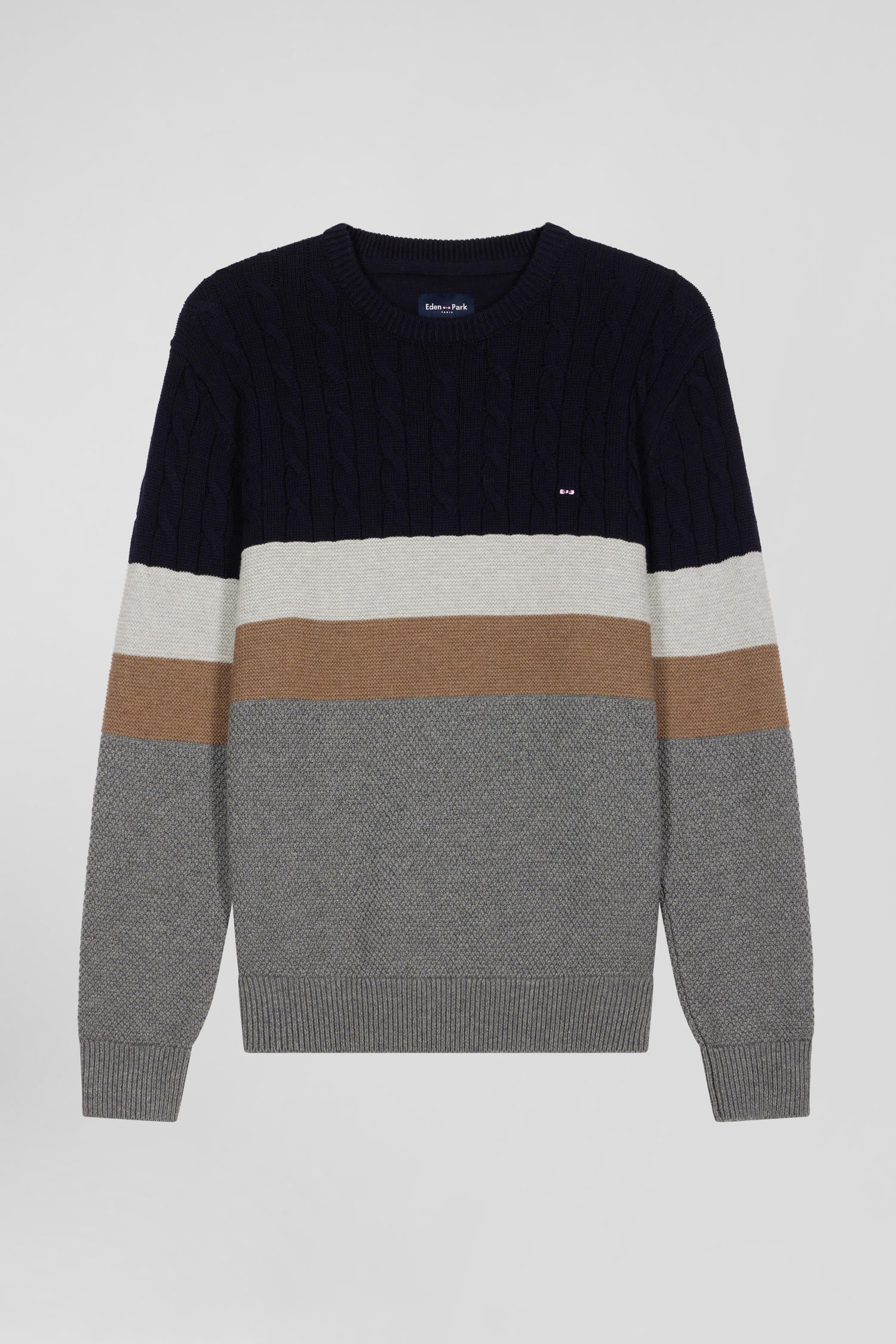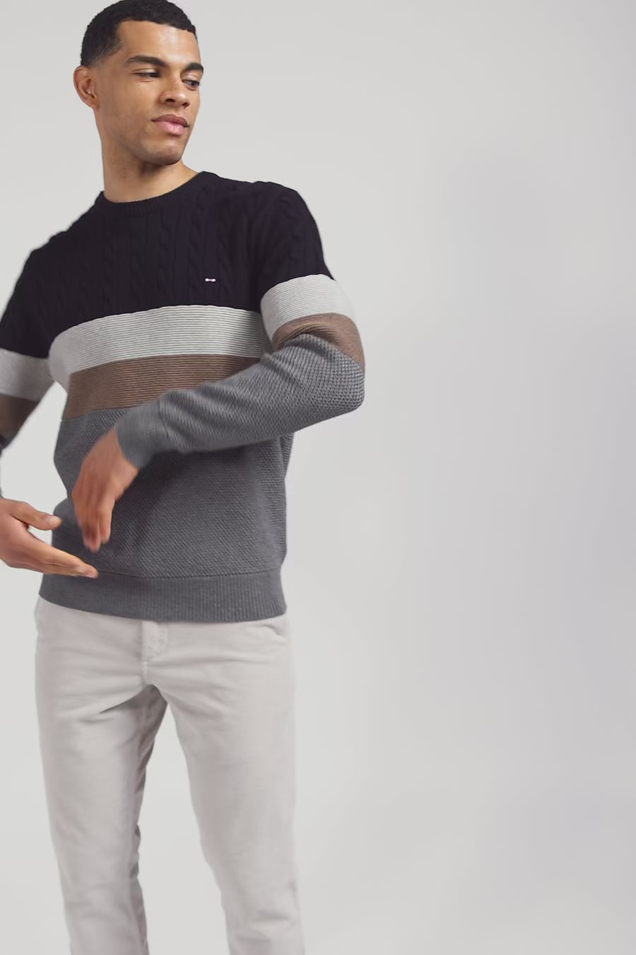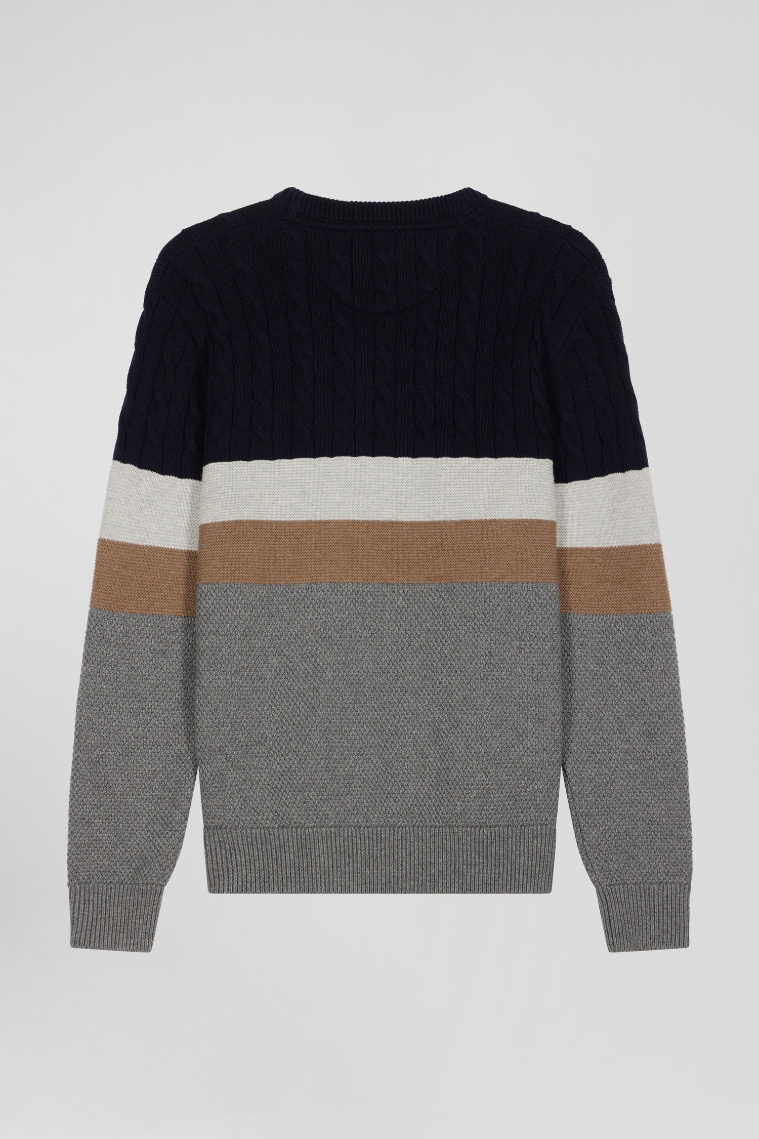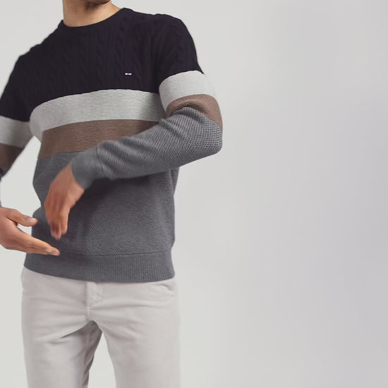 The relaxed elegance of this men's round-neck sweater comes from its design, which features alternating twists and knits in Ottoman and pique stitches, creating a play of textures that complements its skillfully combined colors. Its soft, breathable cotton makes it the perfect choice for an elegant, comfortable look all autumn/winter long.