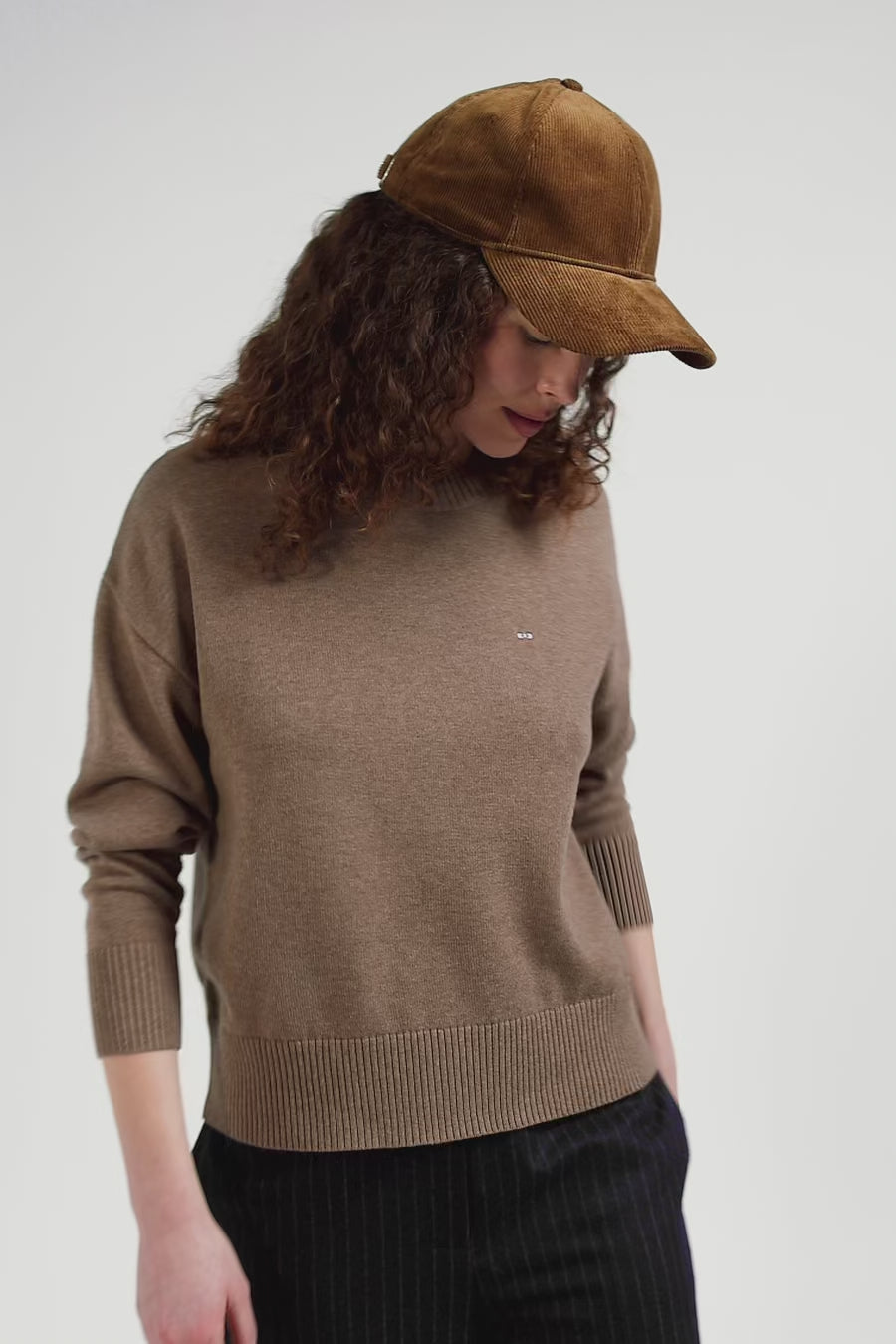 Our elegant round-neck sweater is designed to combine style and comfort. Crafted from a rich blend of wool and cotton, this sweater benefits from the natural properties of these fibers, offering warmth, softness and breathability. The Relaxed cut adds a touch of casual chic, while the discreet bowtie logo embroidery adds a subtle signature to this women's sweater. Available in a range of colors, this timeless piece is a perfect choice for those who value quality and durability in their wardrobe.
