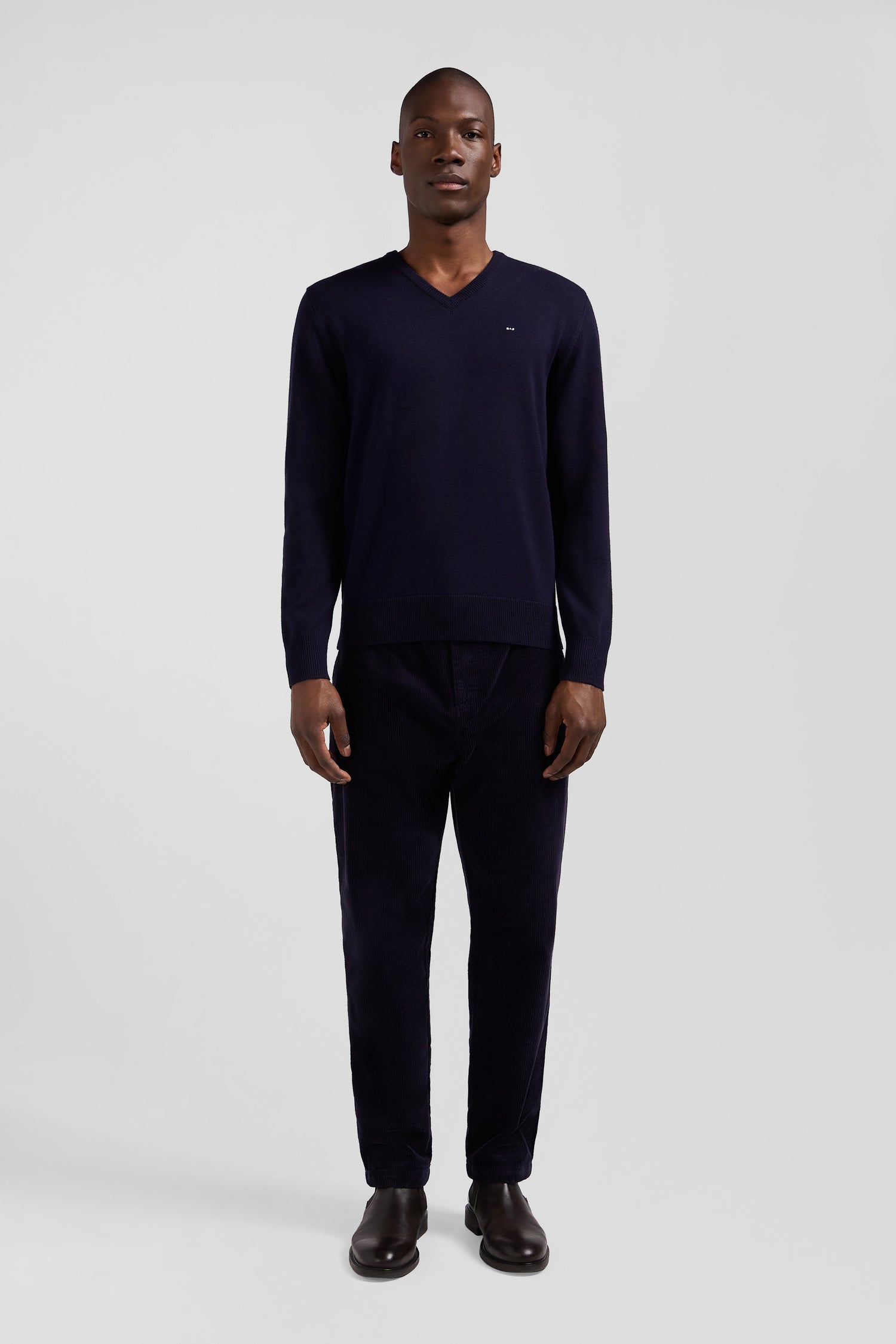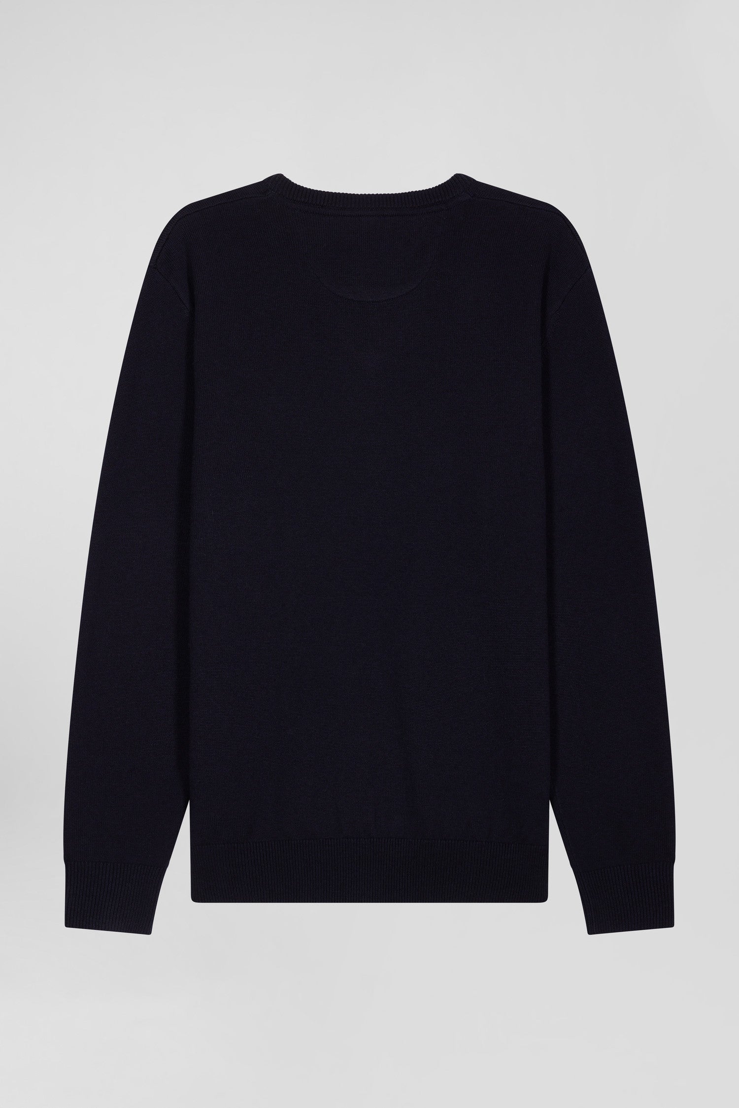 Discover the softness of a jersey knit combining the warmth of wool and the lightness of cotton in this plain V-neck sweater. Each hue is enhanced by a hooped striped inner half-moon, varying according to color for an elegant contrast. The embodiment of the company's expertise, this men's sweater is ideal for a casual look with jeans, or under a blazer for a more formal look in the depths of winter.