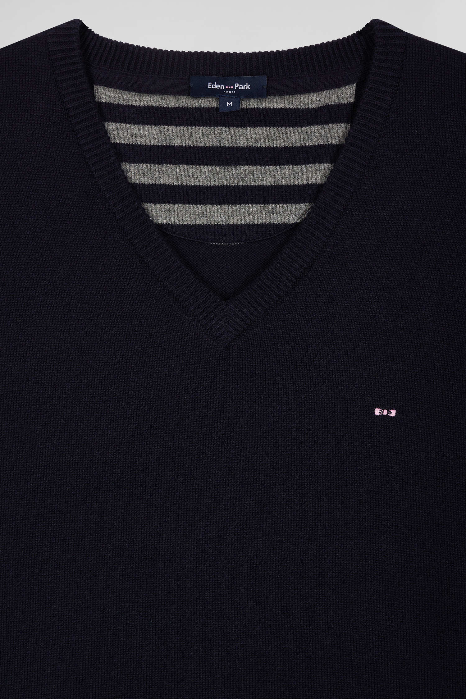 Regular navy wool and cotton V-neck jumper with striped details
