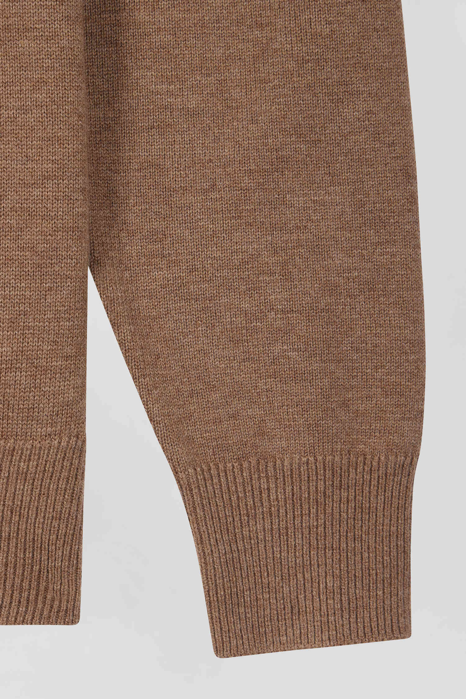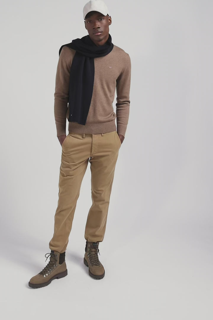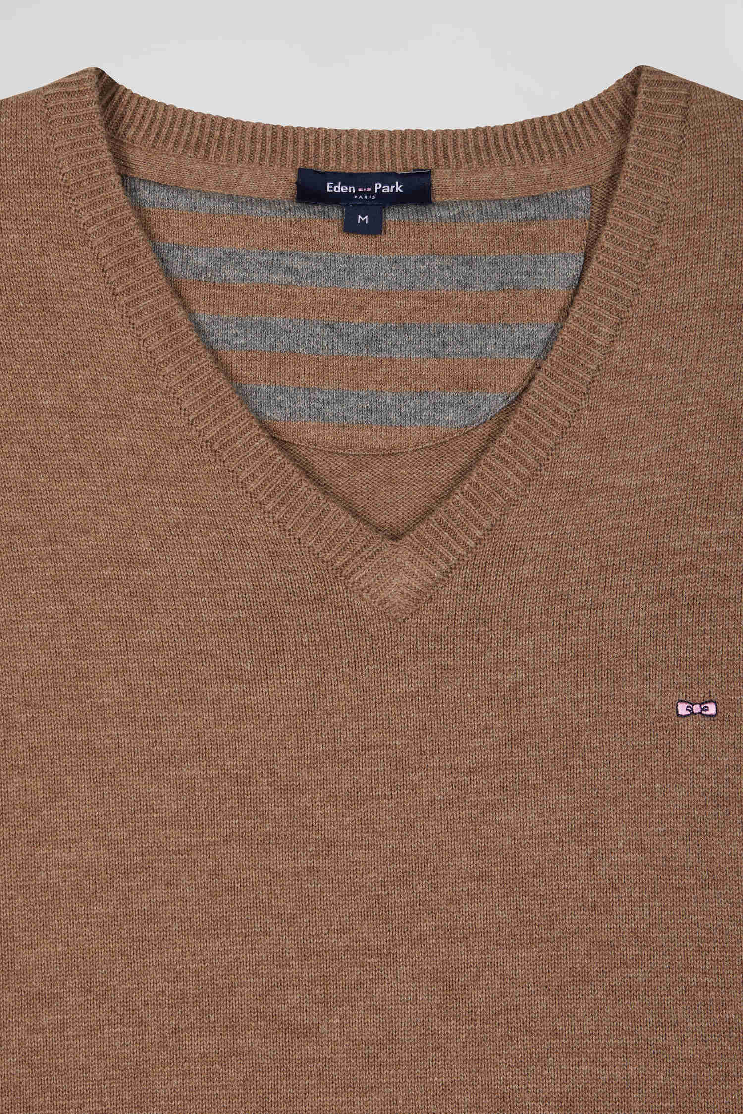 Regular camel wool and cotton V-neck jumper with striped details