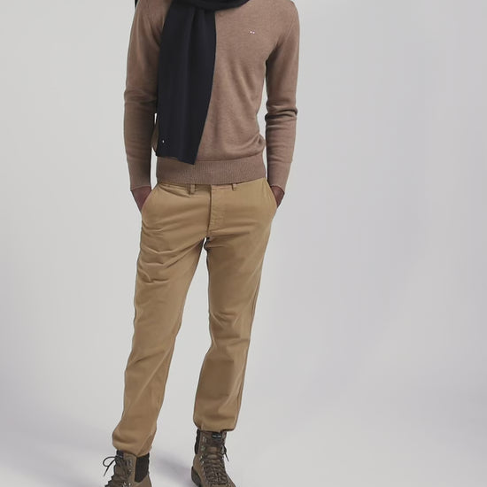 Discover the softness of a jersey knit combining the warmth of wool and the lightness of cotton in this plain V-neck sweater. Each hue is enhanced by a hooped striped inner half-moon, varying according to color for an elegant contrast. The embodiment of the company's expertise, this men's sweater is ideal for a casual look with jeans, or under a blazer for a more formal look in the depths of winter.