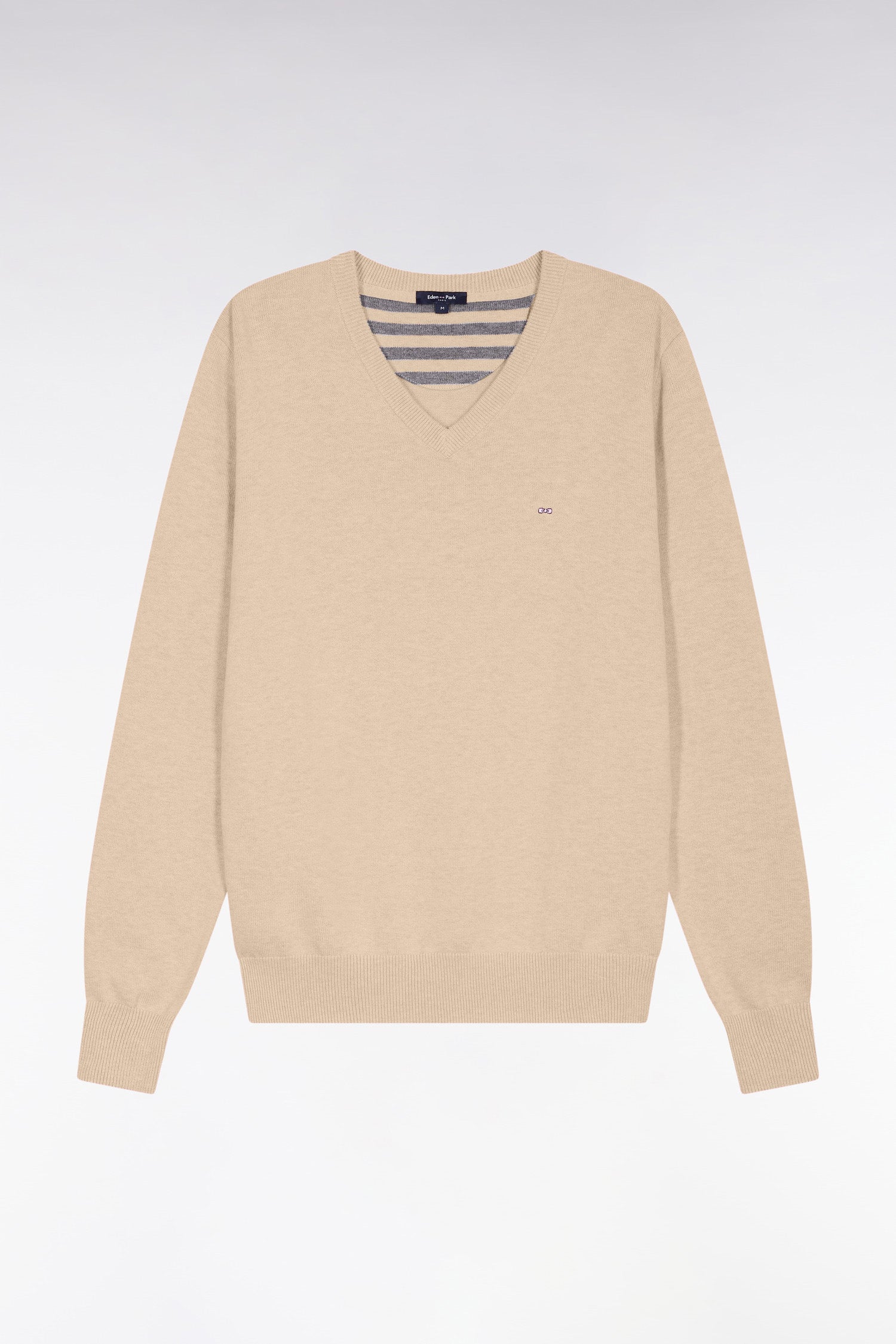 This elegant V-neck sweater in wool and cotton blend features the comfortable, versatile straight cut of our classic sweater in a range of different neckline versions. This model features our iconic bowtie embroidery on the chest and a rugby-striped half-moon inside. Perfect for energizing a silhouette with a controlled touch of color, thanks to the wide choice of colors offered here.