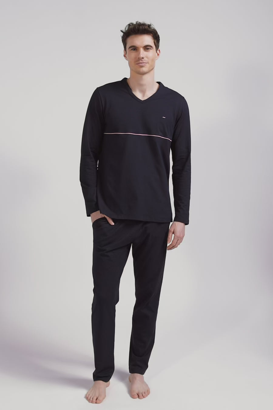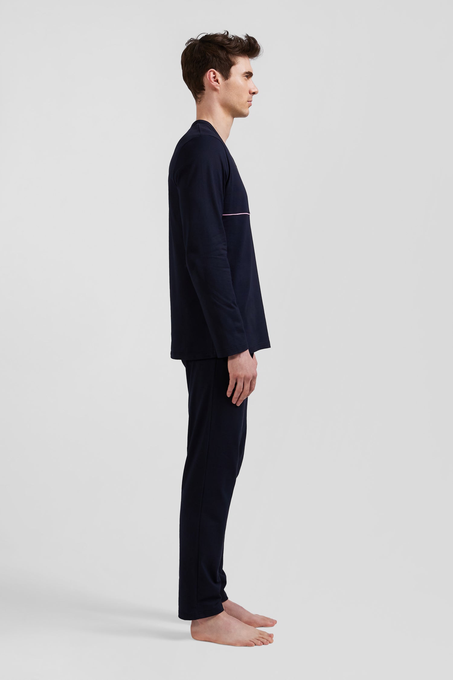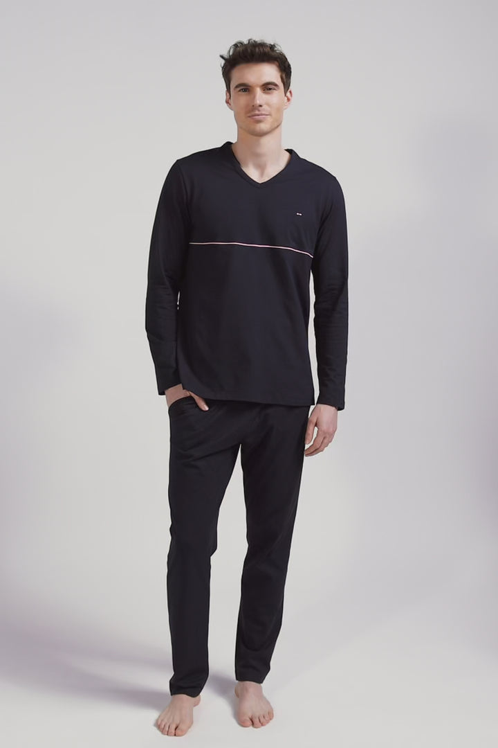 This navy blue pajama set features a long-sleeved T-shirt brightened up by contrasting piping on the chest. Pants with a branded elasticated waistband provide comfort and support for your nights of sleep and weekend relaxation.