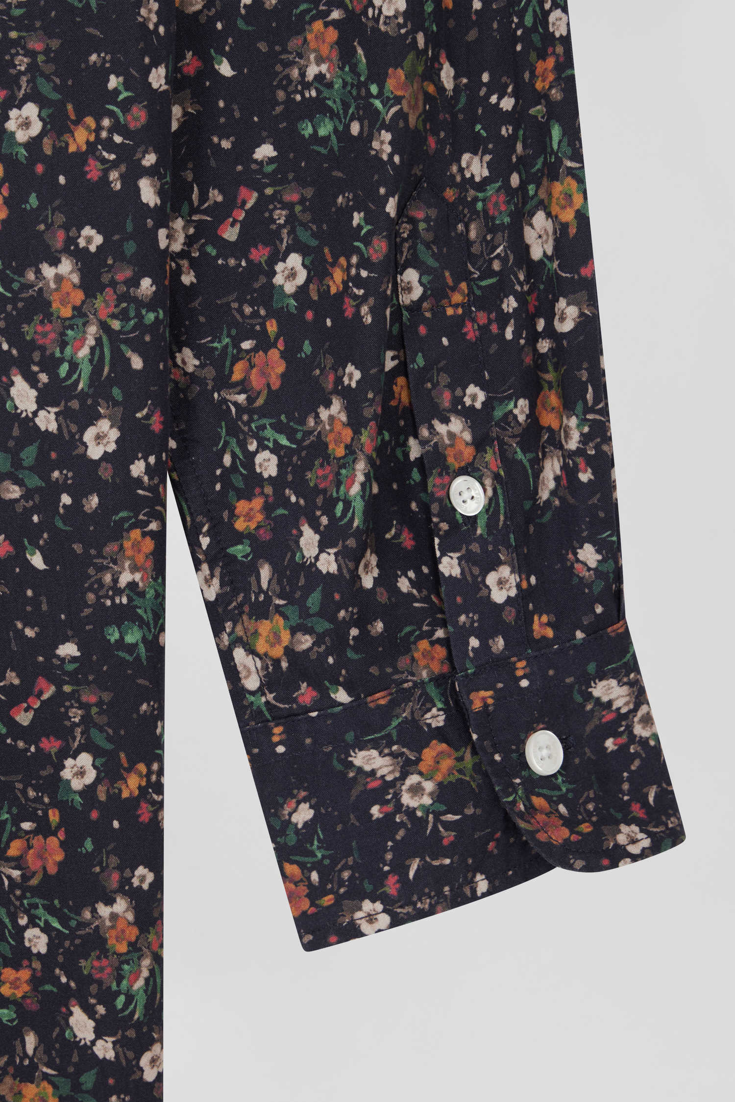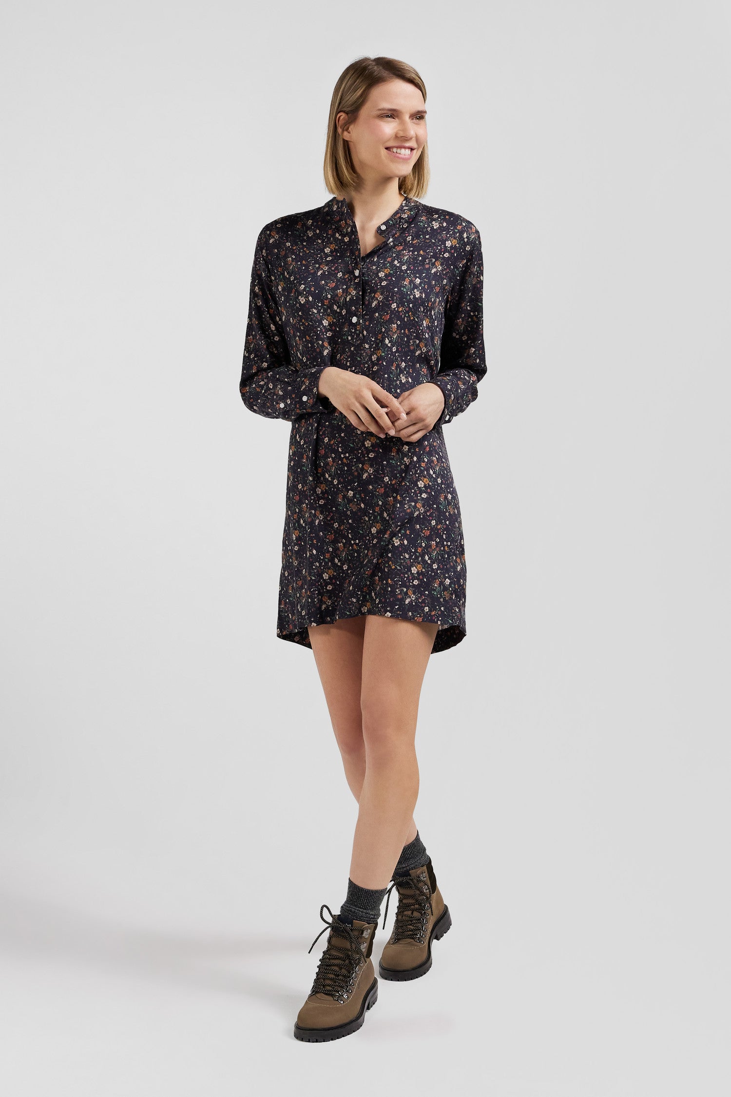 Ideal for any occasion, this black shirtdress features a delicate floral print, made exclusively for our Maison. The oval rugby buttons along the placket and on the cuffs underline the attention to detail in our collections. With its small round collar, this straight dress in soft, durable lyocell elegantly enhances the head carriage.