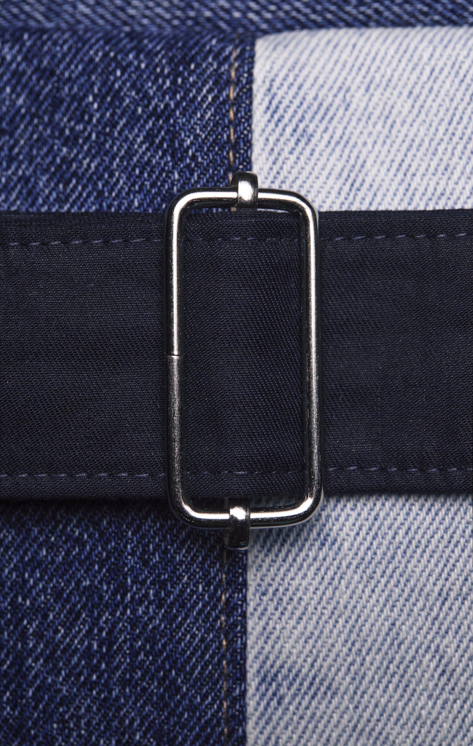 Imagined and handcrafted as part of our Pap'Atelier capsule, this two-tone denim fanny pack was made from scraps of our jeans transformed into bobs and tote bags for the same exclusive and sustainable collection. The zips come from archival garments, given a new lease of life in our workshop, while new metal buckles guarantee comfort and sturdiness. An interior zipped pocket and adjustable strap complete its functional design, designed to optimize everyday use. With its main zipper (length 27cm), its upcycled label in stylized leather and its generous dimensions, this accessory combines practicality, originality and a commitment to more sustainable fashion. Dimensions: 40cm x 17cm
