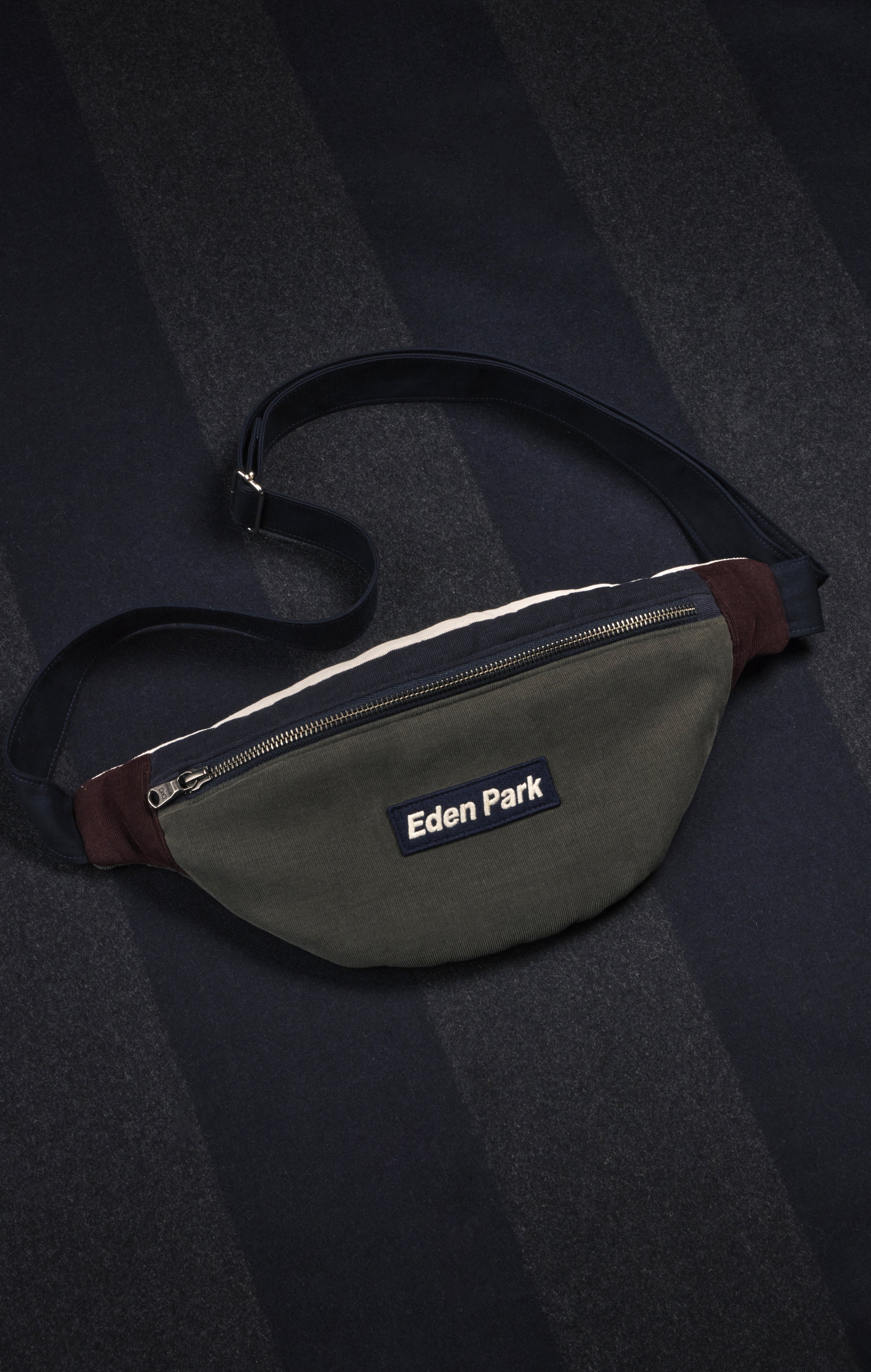 Le sac banane est devenu un accessoire indispensable pour le quotidien pour un homme comme pour une femme souhaitant avoir les mains libres tout en conservant ses essentiels à portée de main. Ce modèle en velours kaki est une pièce unique réalisée artisanalement à partir de chutes de tissus prélevées dans d'anciennes chemises Eden Park upcyclées pour la création d'un gilet sans manches et d'un sac. Ce sont donc 3 nouvelles créations Eden Park qui sont issues de la revalorisation de ces archives ! La sangle réglable a été confectionnée à partir de chutes de tissus tandis que ses fermetures zippées principale et intérieure et son écusson Eden Park trouvent à leur tour une seconde vie. Un accessoire urbain exclusif à retrouver sur notre site internet pour une durée très limitée.