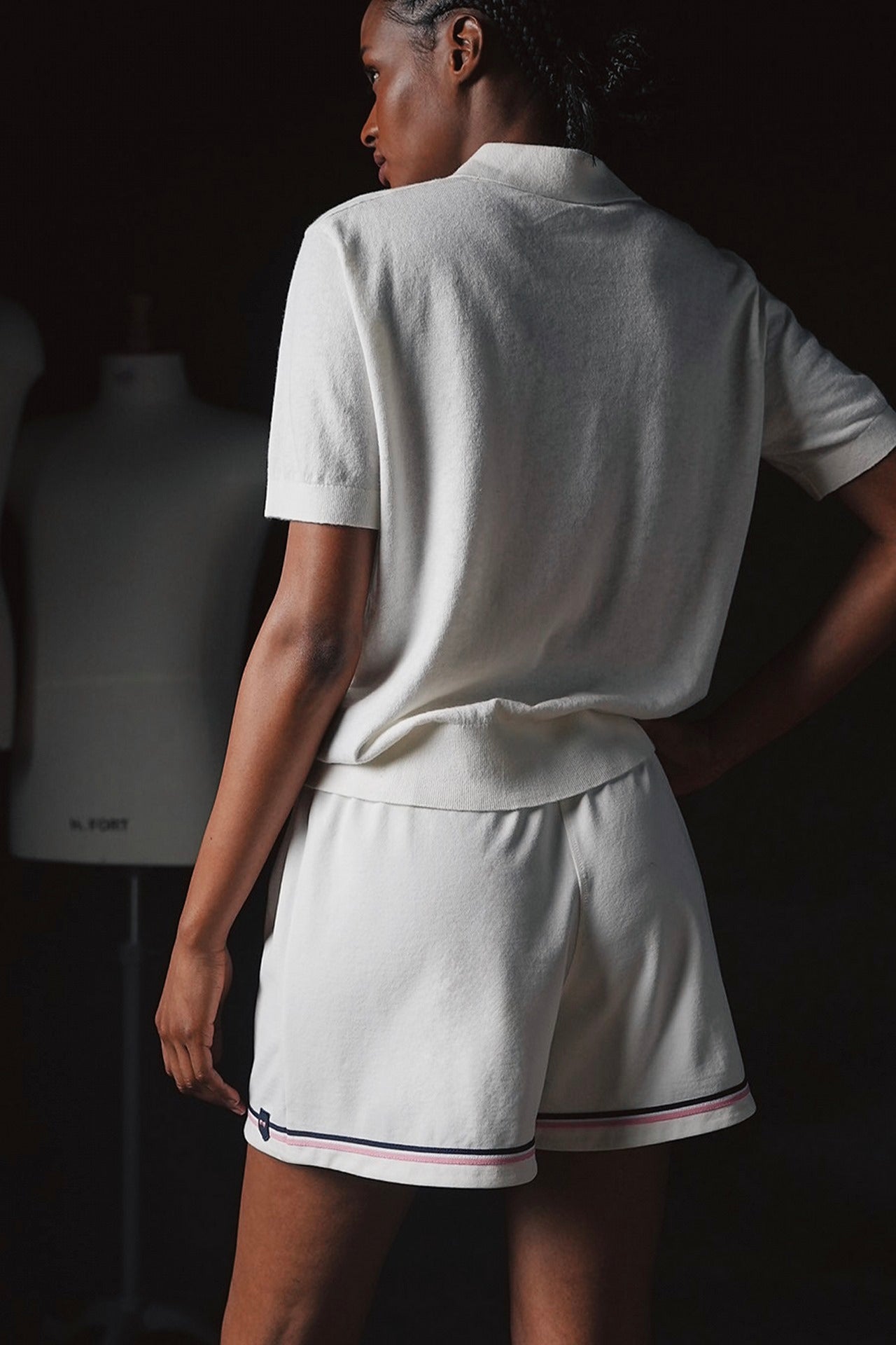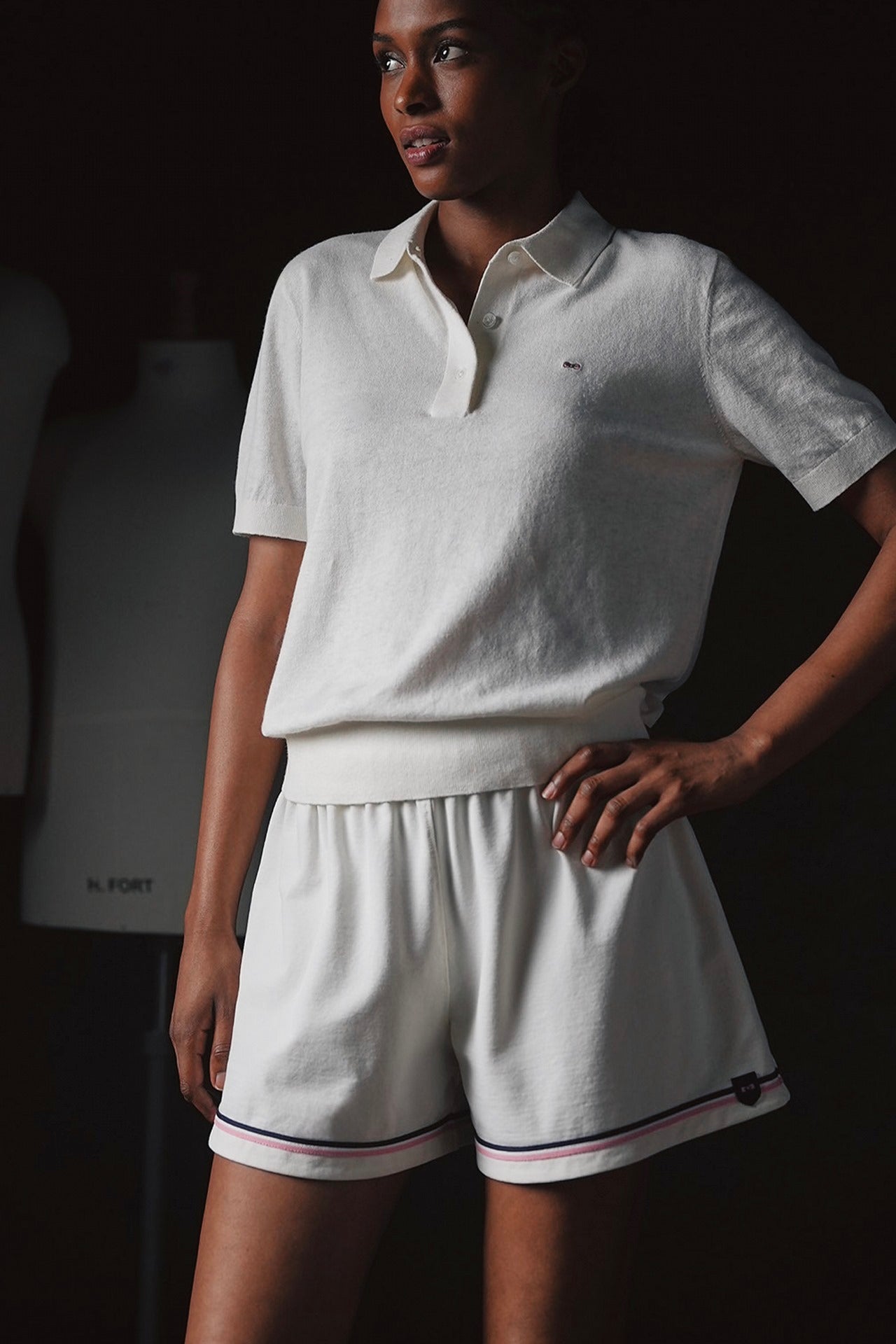 It's hard to imagine that these women's shorts in white stretch cotton were made from a large men's jersey! It took all the creativity and know-how of our Parisian atelier to bring this unique piece to life, available in a single piece in size M. Thanks to its elasticated waistband, these white shorts are suitable for many body shapes, offering ease and freedom of movement. The striped braid at the bottom of the legs and the crest add to the elegant, athletic aesthetic of these women's shorts. A unique model from the Upcycling Pap'atelier capsule collection created in Paris, on sale exclusively at www.eden-park.com for a limited time only.