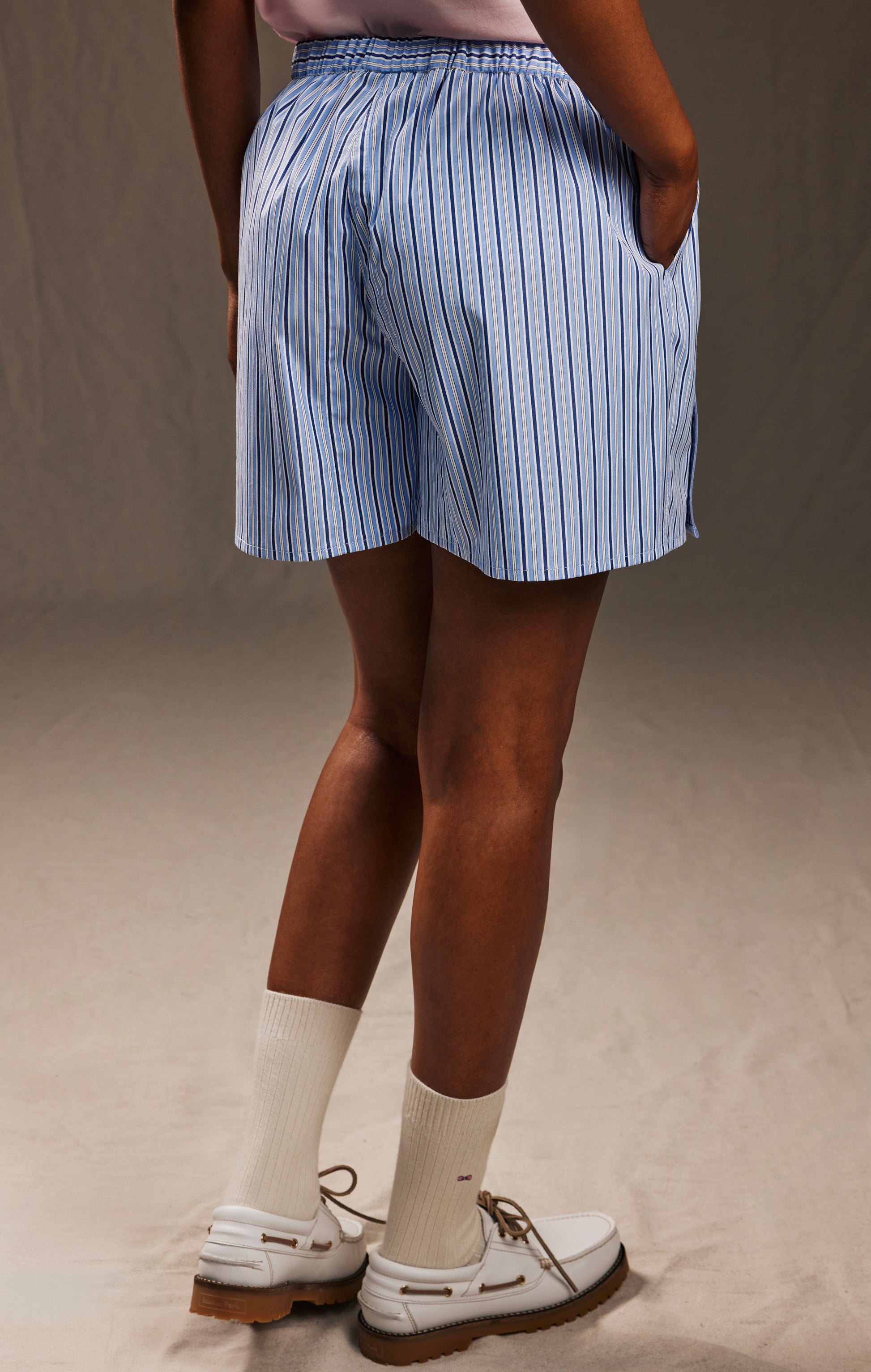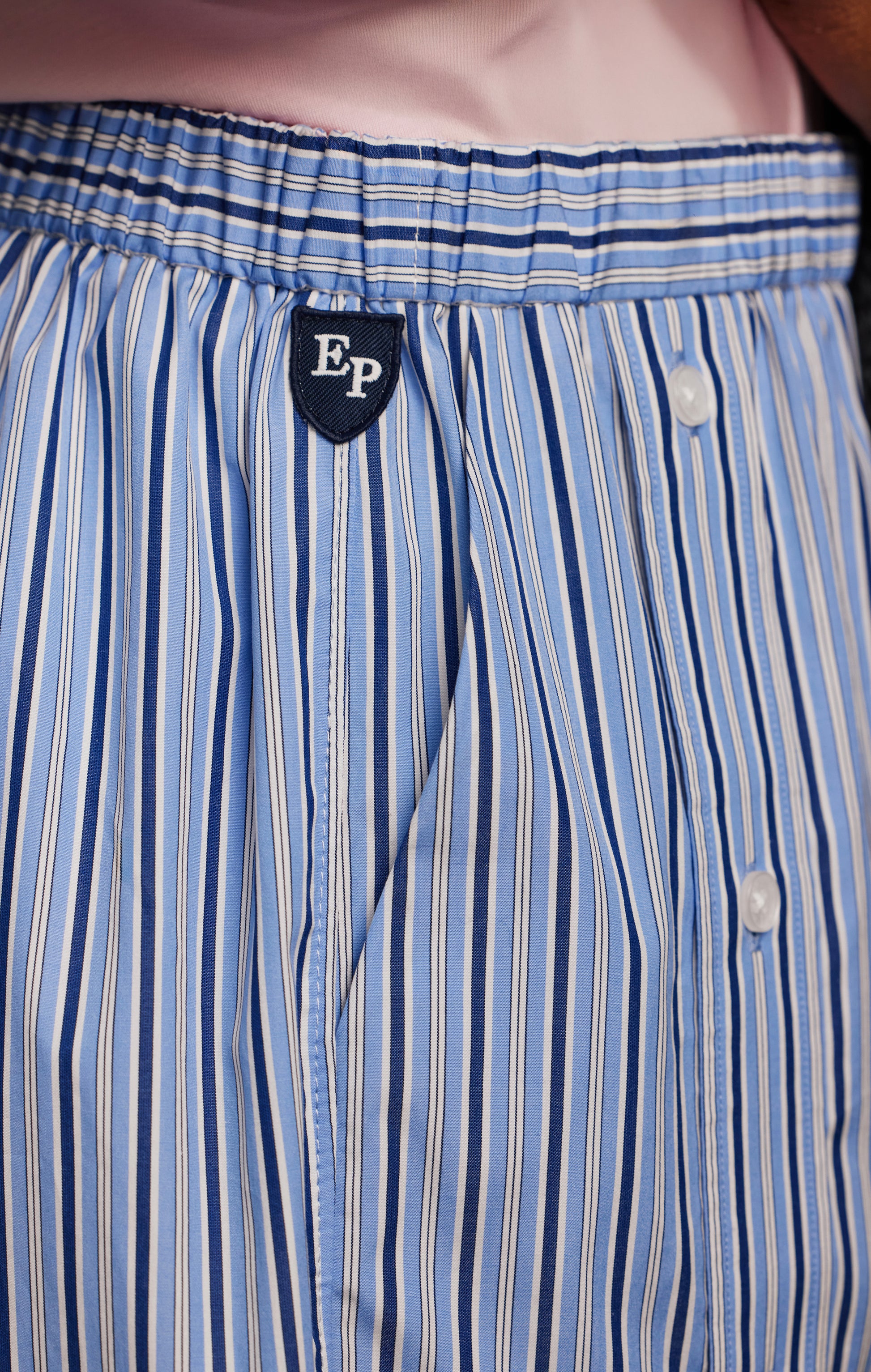 These lightweight striped cotton poplin shorts are crafted from a men's shirt from our past collections, meticulously reworked by our workshop manager. The original button placket, adorned with elegant oval branded rugby buttons, has been preserved and repositioned on the side, adding a touch of refined originality to the design. With an elasticated waistband, these size M women's shorts adapt effortlessly to different body types, offering both comfort and style. A small recycled Eden Park patch is delicately embroidered near the side pockets, reinforcing their signature charm. This one-of-a-kind casual-chic piece is a testament to our Maison’s dedication to both style and responsible fashion. Handcrafted in Paris, it is part of our Pap'Atelier capsule collection and is available exclusively on our website—for a limited time only.