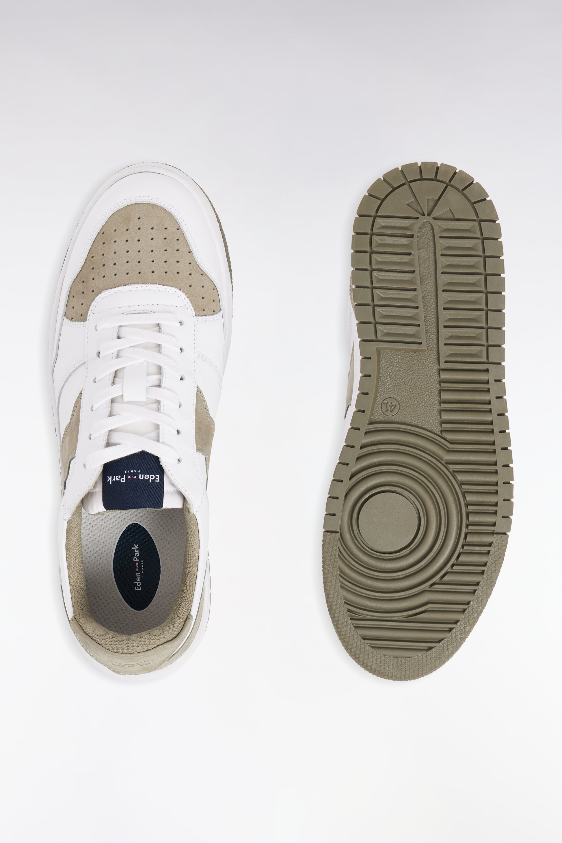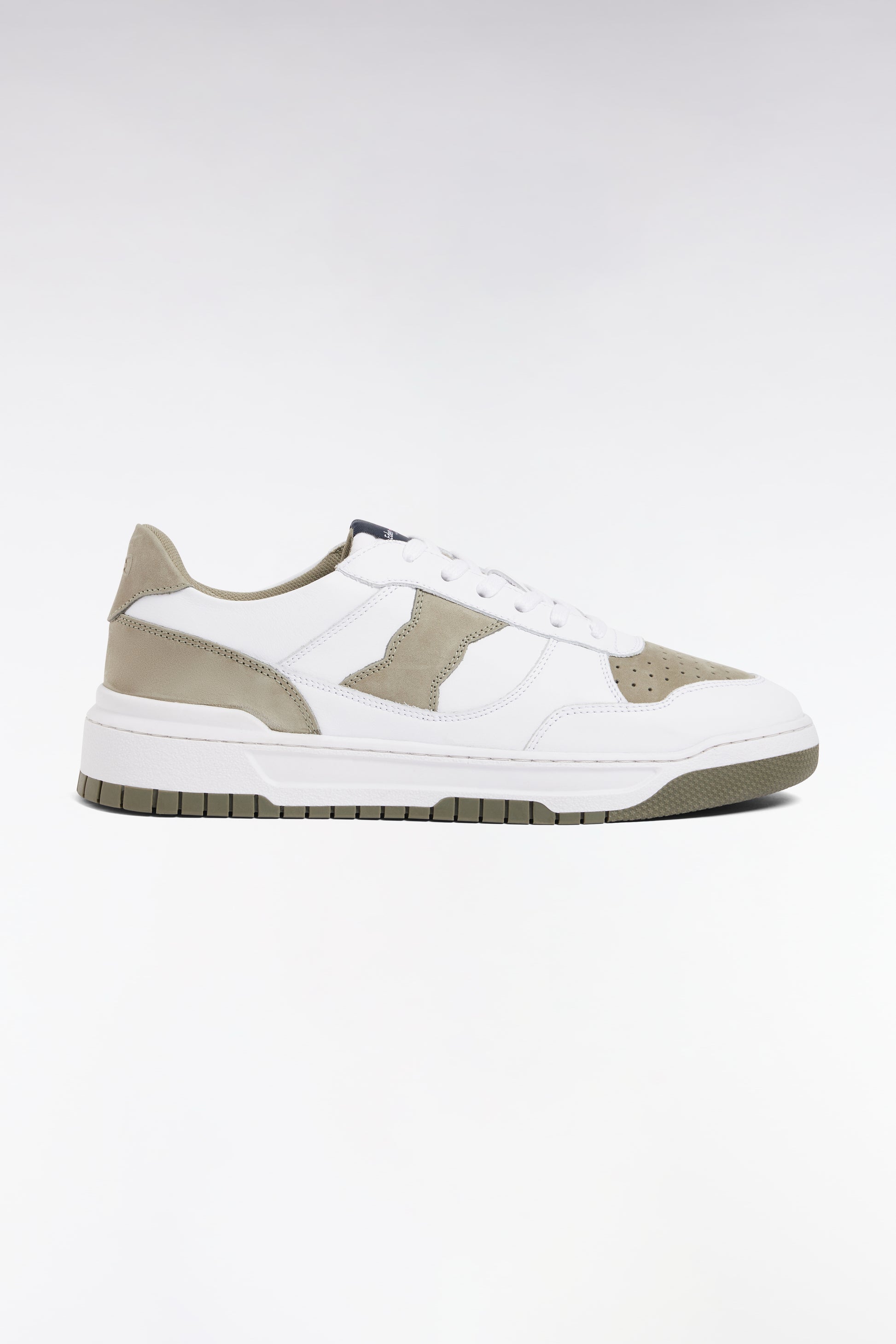 Sneakers bicolores en cuir lisse blanc et cuir suédé kaki
