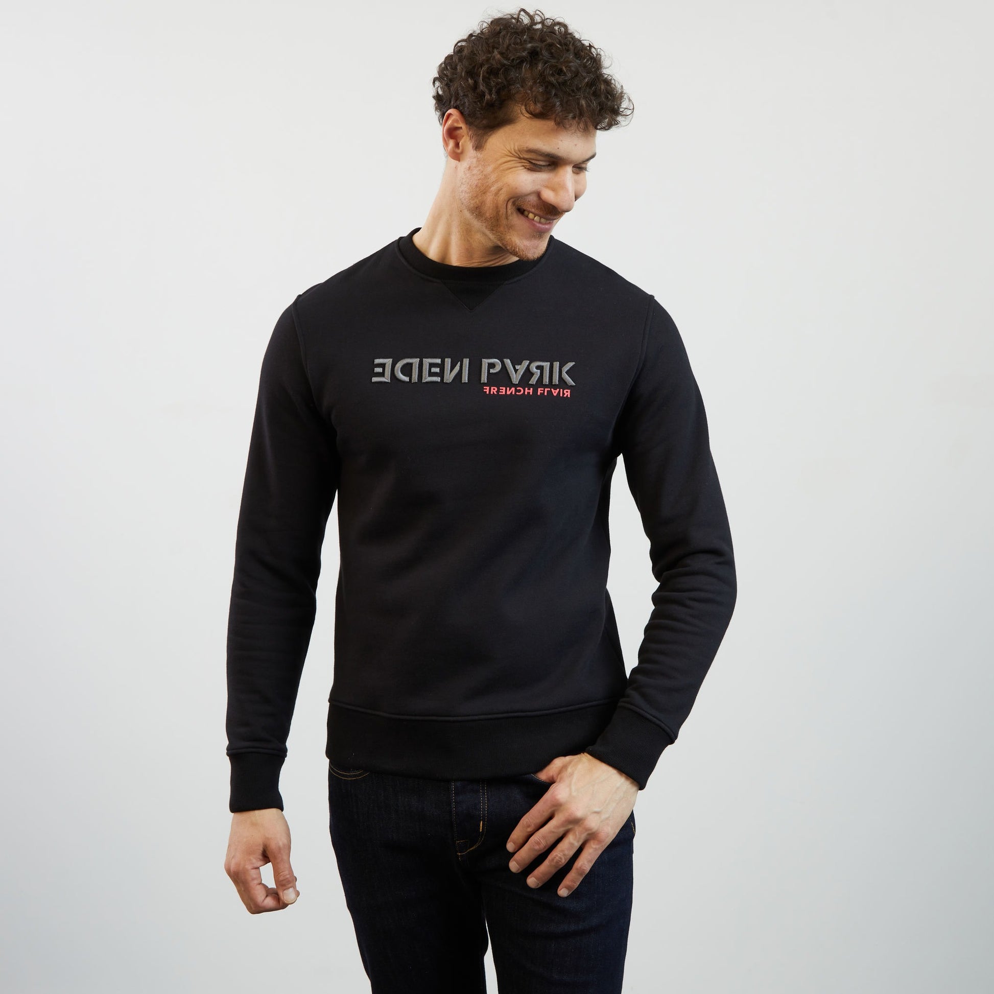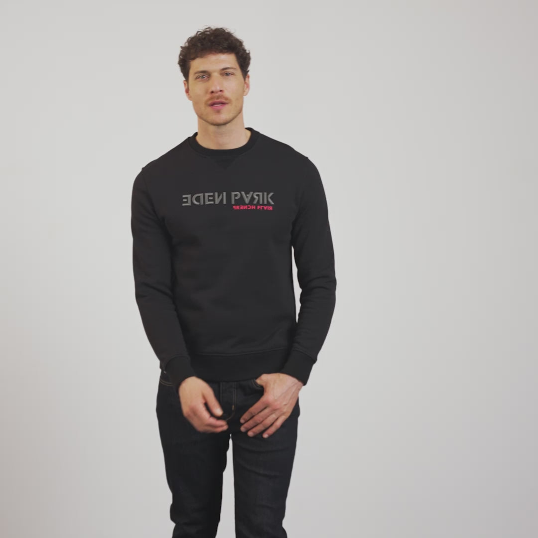 This round-neck sweatshirt features a graphic embroidered Eden Park label and a flocked French Flair label just below.