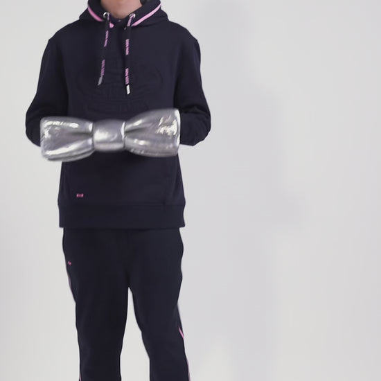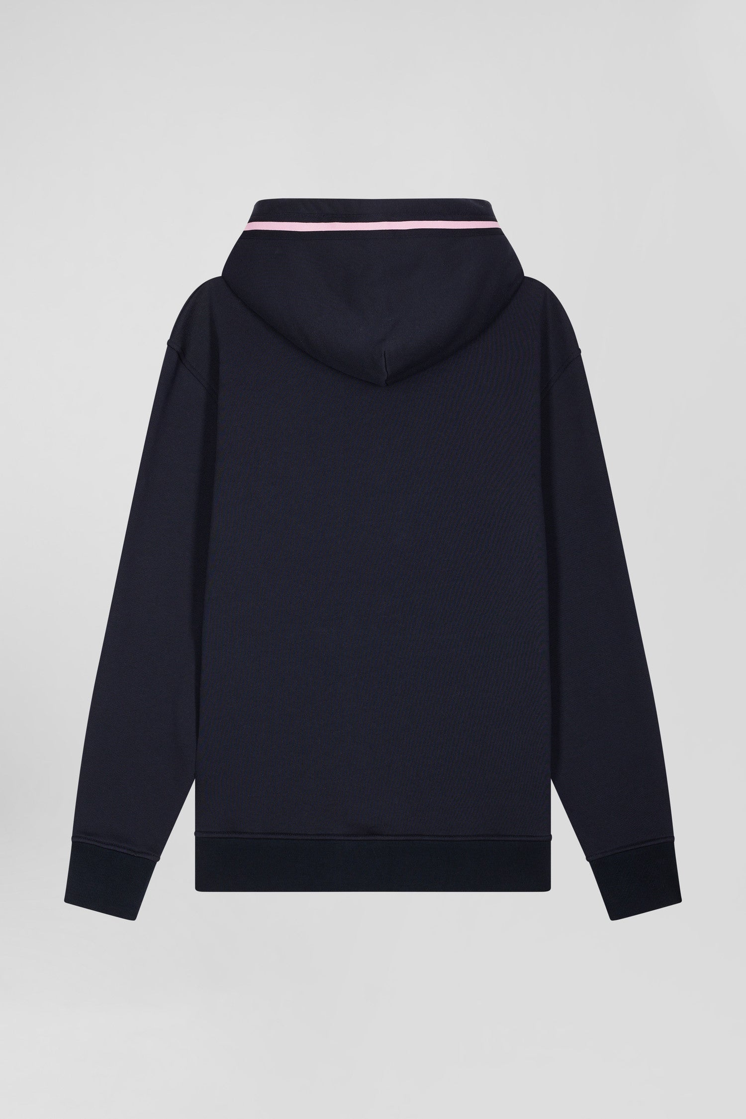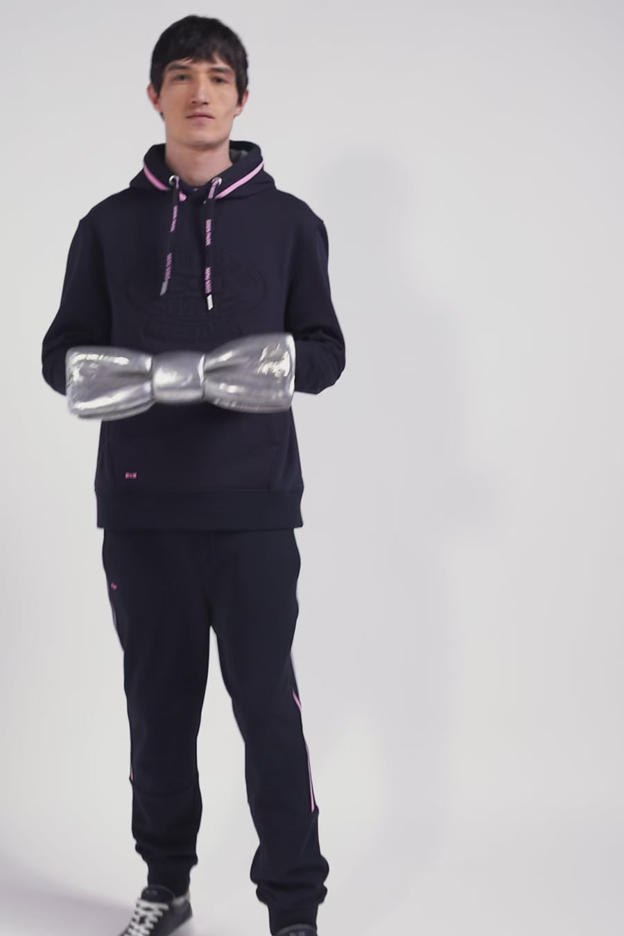 Invite softness and style into your autumn-winter wardrobe with this hooded sweatshirt in brushed fleece. It features quilted embroidery on the front and a practical kangaroo pocket. A knitted ribbon in navy and pink elegantly accentuates the hood, while the signature drawstrings with metallic finishings add a touch of distinction. Three-tone lining stripes reflect our meticulous craftsmanship, for high-end comfort and a sporty-chic look.