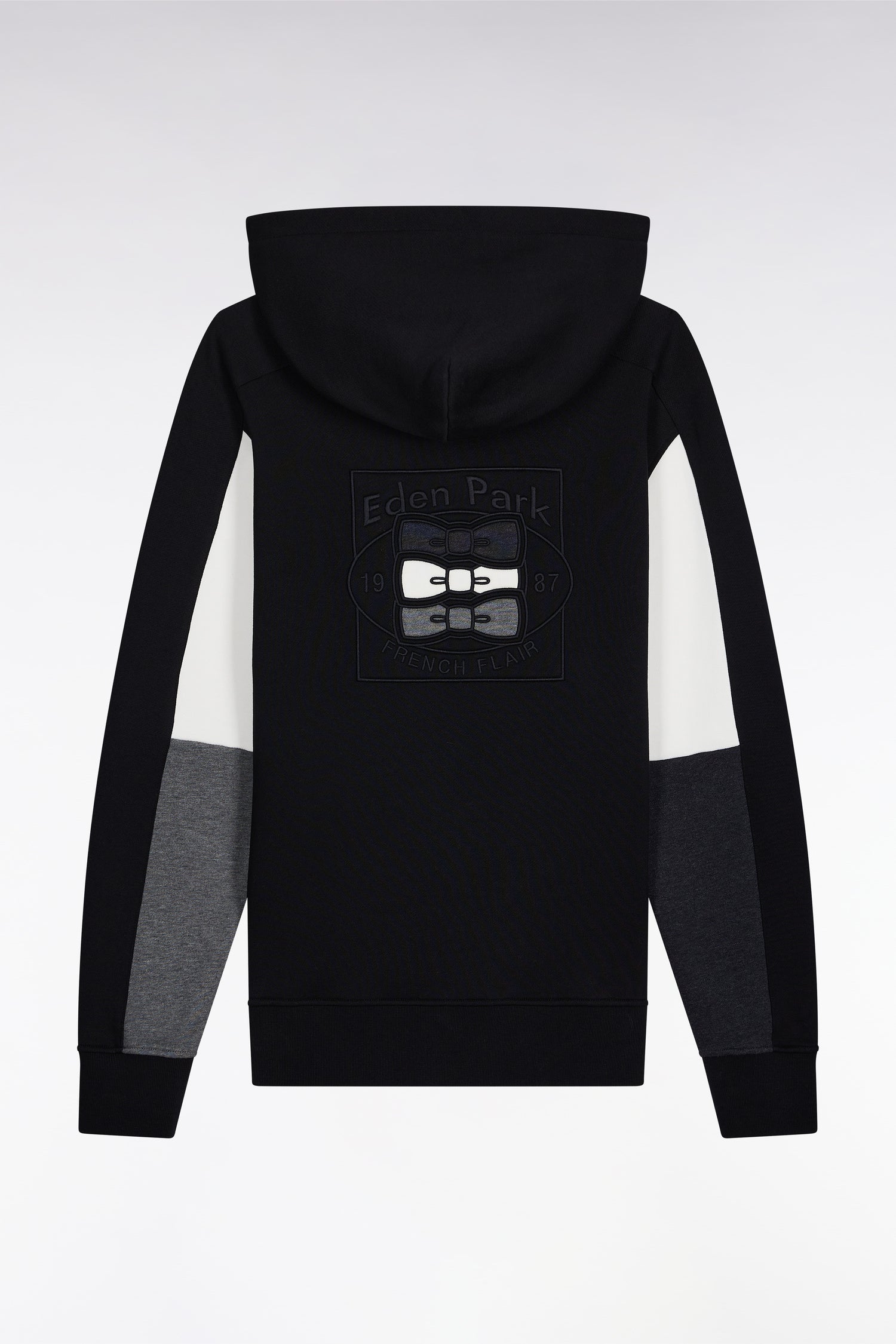 This tricolored hooded sweatshirt in brushed fleece combines comfort and graphic spirit. Its slightly thick fleece offers soft warmth ideal for everyday wear, while the contrasting cut-outs on the sleeves and the lined hood in gray or light colors energize the masculine silhouette. On the back, embroidered jersey inlays add a sporty-chic touch to this sweatshirt designed to keep pace with your lifestyle. Discreet yet distinctive codes, for those who know how to read between the lines of a sophisticated wardrobe, a perfect balance between sportiness and urban allure.