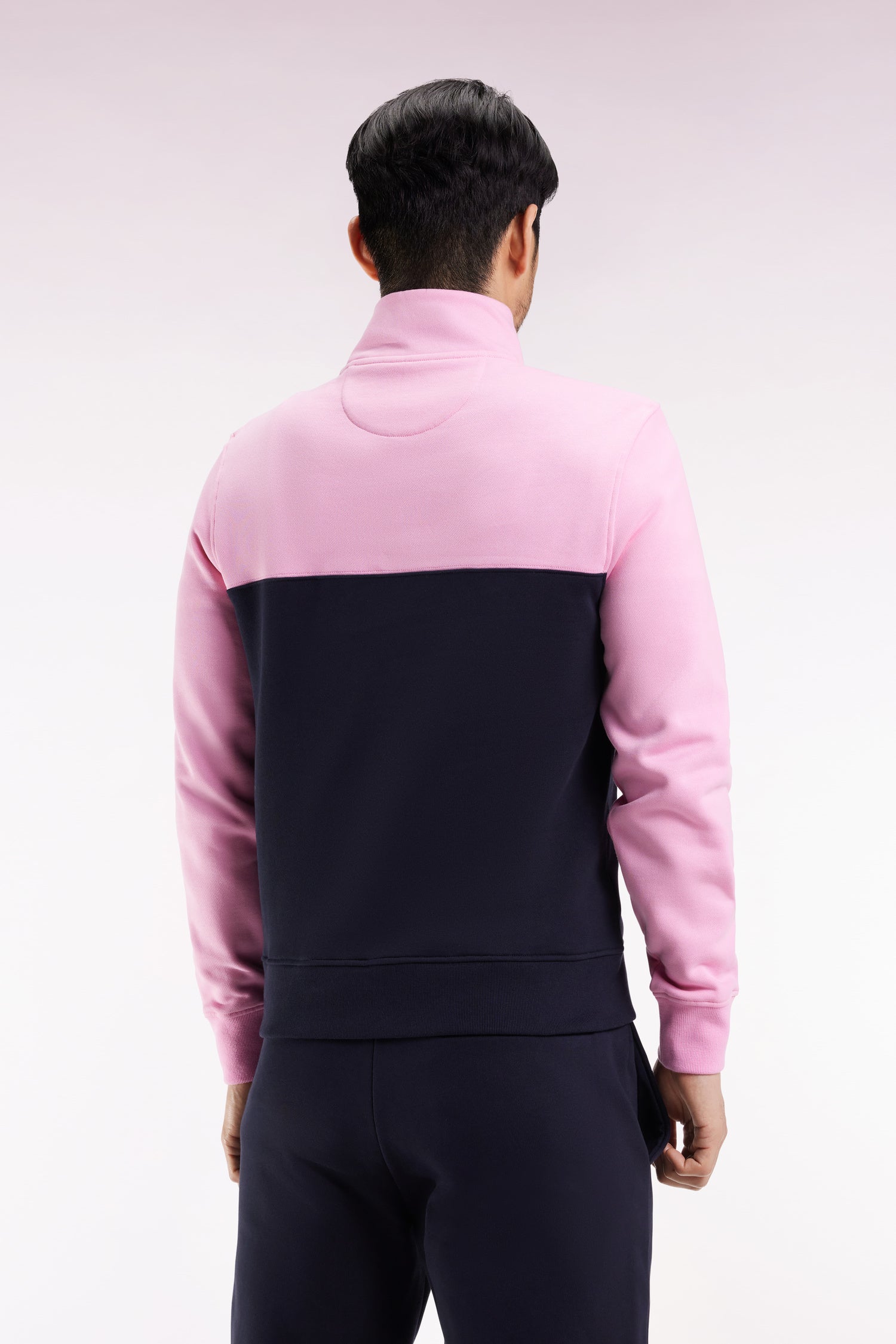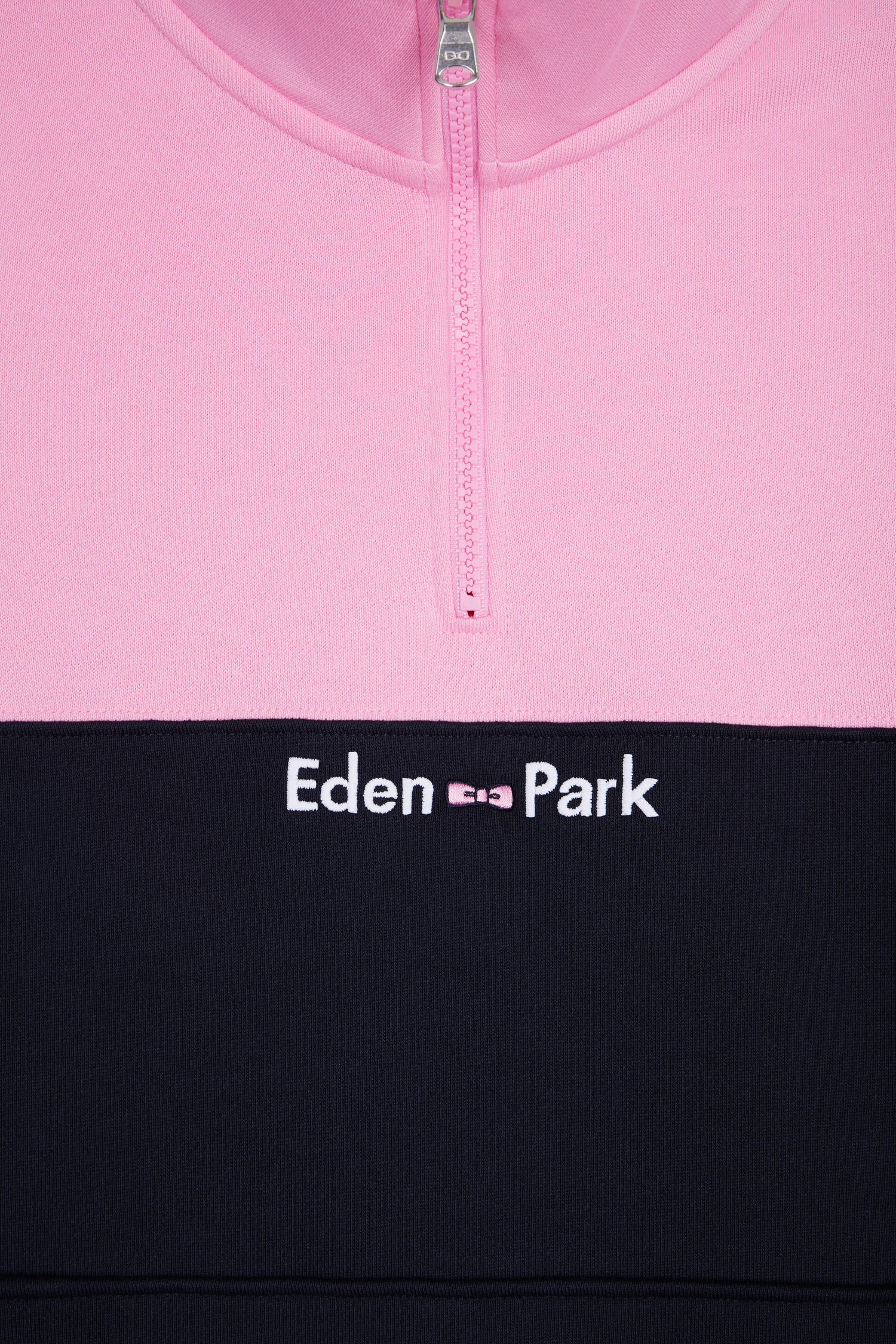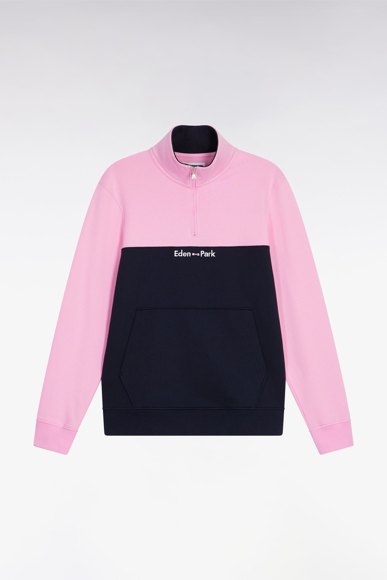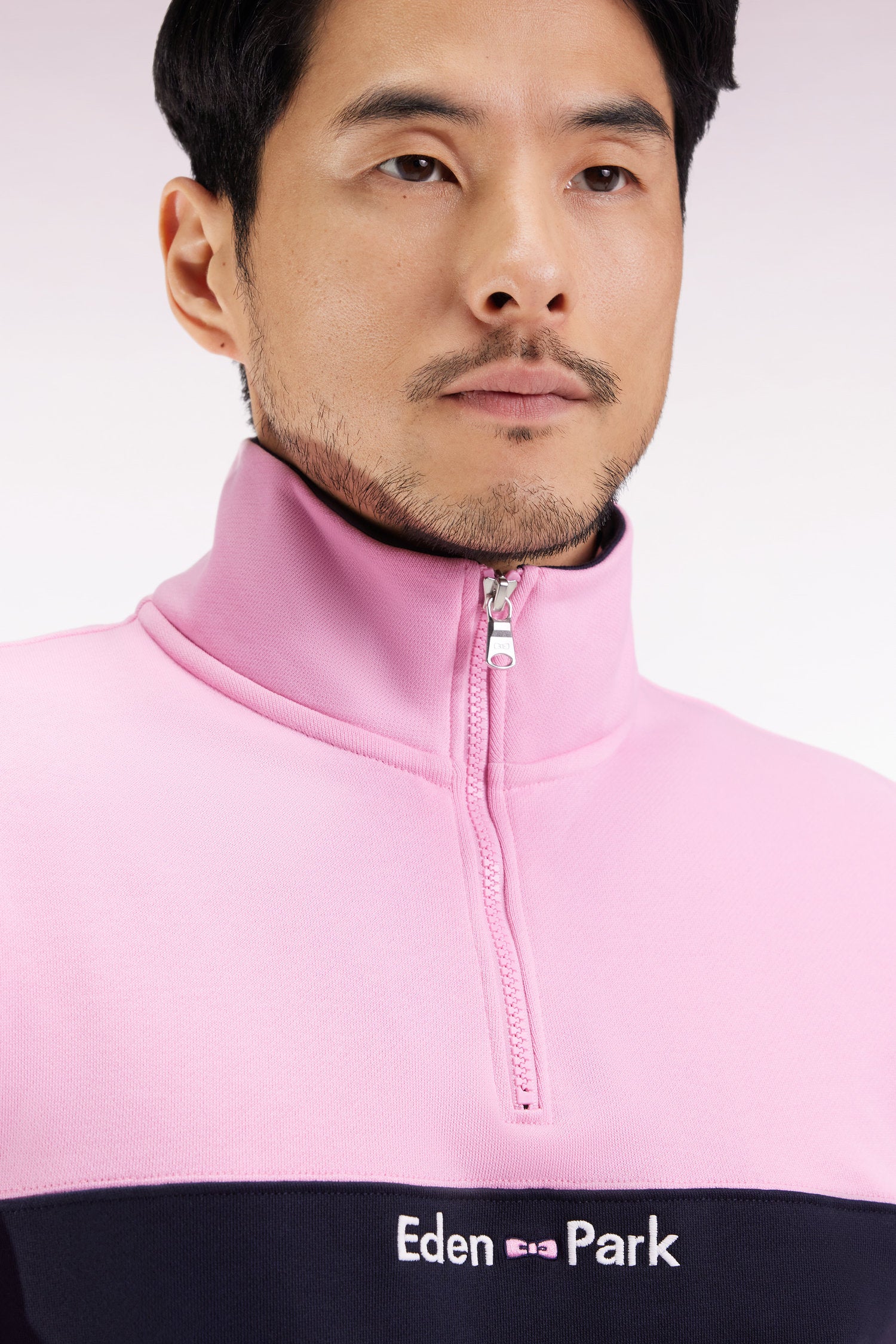 This men's sweatshirt with trucker collar is made from two-tone brushed fleece. Available in navy and pink, sky or white combinations, it features a tonal zip and Eden Park embroidery on the chest. Ribbed cuffs, hem and collar provide comfort and structure to this sports-inspired piece.
