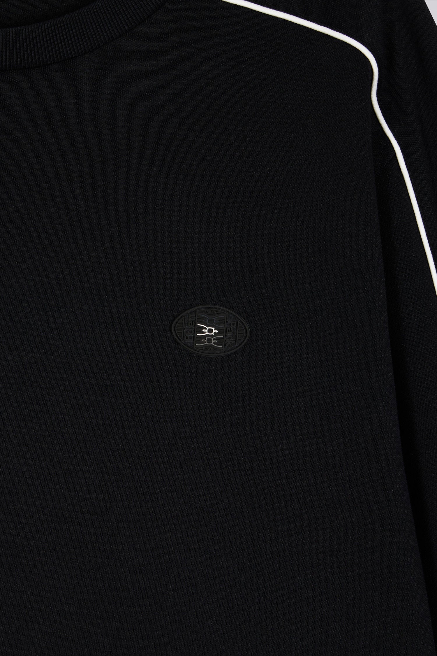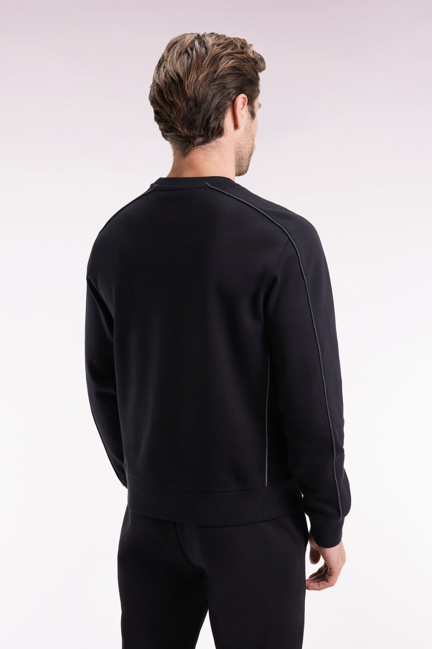 This round-neck sweatshirt in a brushed cotton fleece blend combines comfort and character. Available in black or navy, it features back embroidery with raised contours and contrasting piping to enhance the silhouette. The ribbed neckline and cuffs reinforce the structured look of this sporty-chic model, emblematic of the Eden Park wardrobe.