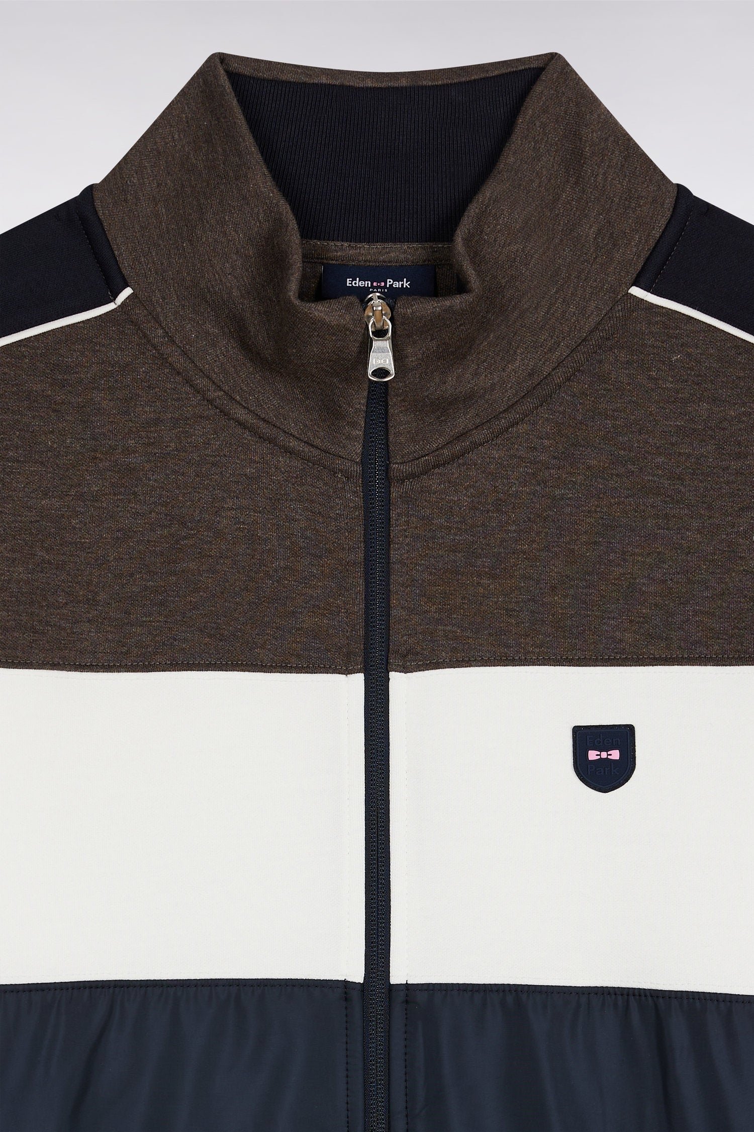 This high-neck zip-up sweatshirt revisits sporty codes with a bold tricolor construction and contrasting nylon inserts. Crafted in comfortable interlock, it boasts a structured, athletic look, highlighted by flat piping along the sleeves. Contrast collar inserts, metal trims and ribbing add style and support. Available in two color versions