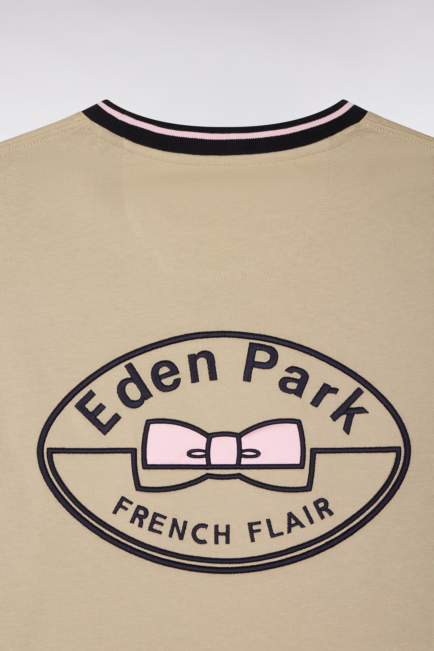 Ce T-shirt manches courtes pour homme adopte une esthétique sobre relevée par un motif emblématique : sa broderie dos Eden Park rehaussée par un luxueux tissu cravate imprimé. Sa coupe confortable et sa matière douce en font un T-shirt agréable à porter, parfait pour accompagner les silhouettes décontractées avec élégance. En beige ou en kaki, ce T-shirt brodé conserve ses bords-côtes contrastés animé d'un liseré pour une touche graphique et un tomber impeccable.