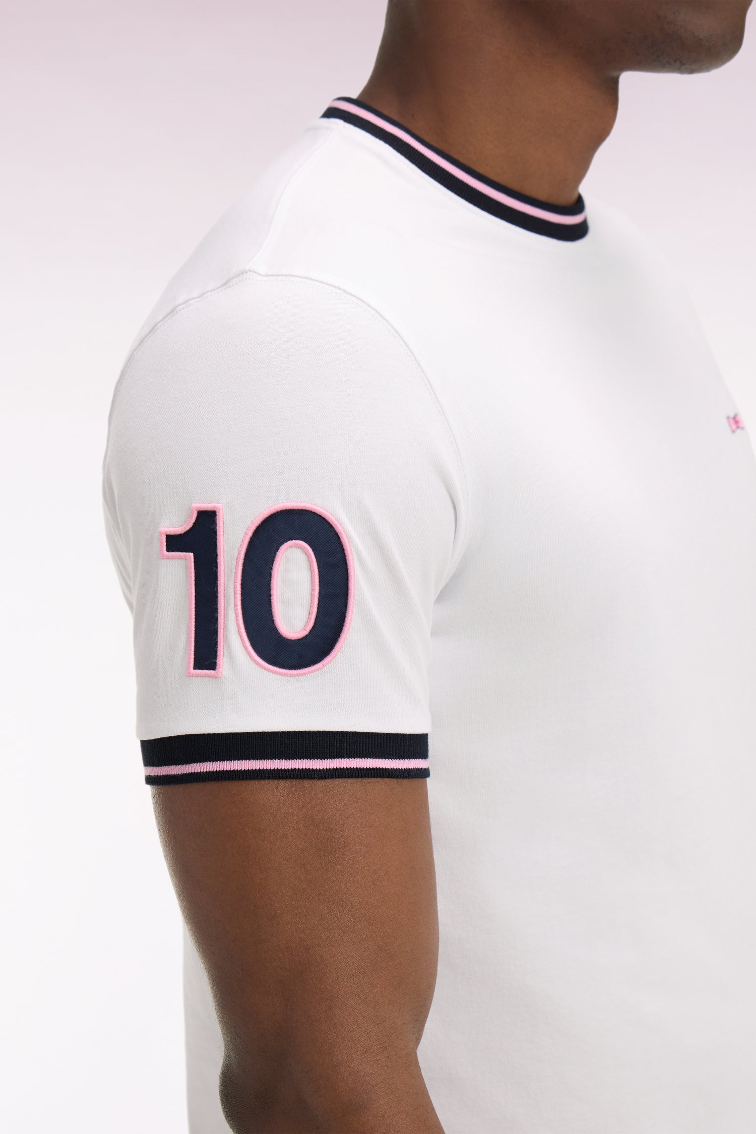 Ce T-shirt homme en jersey de coton revisite un essentiel du vestiaire masculin avec une approche graphique et des codes rugby subtils. Sa coupe droite confortable et ses finitions soignées, broderie 10 hommage au maillot de notre fondateur et bords-côtes rayés, en font une pièce facile à porter au quotidien, idéale pour composer une tenue sport chic décontractée.