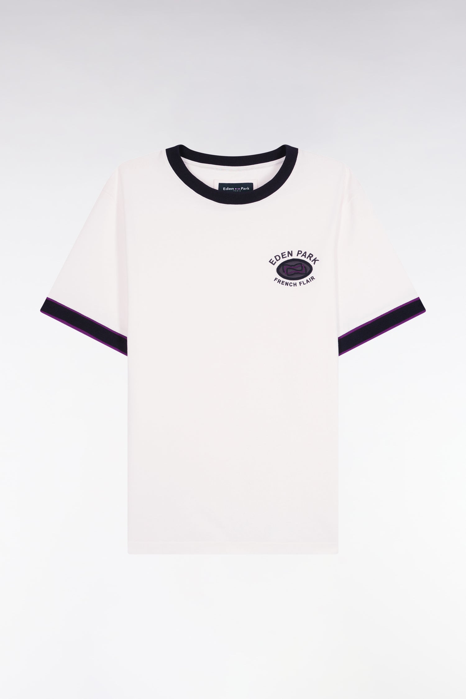 This short-sleeved T-shirt in cotton jersey illustrates Eden Park's sporty style in a sober version with vintage accents. Available in three colors, it offers a supple, comfortable fit for everyday wear and a graphic touch underlined by contrasting ribbing on the collar and on the sleeve edges, which are elegantly raised with a colored stripe. A silicone patch and Eden Park French Flair lettering add to the character of this loose-fitting T-shirt, brilliantly combining style and comfort.