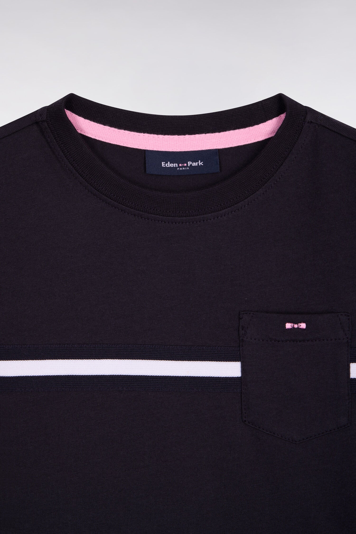 Ce T-shirt à manches courtes en jersey de coton marine adopte une coupe droite confortable, rehaussée de découpes rayées écrues qui apportent une touche graphique et estivale. Sa poche poitrine, son nœud papillon brodé et son passepoil intérieur rose témoignent de l’ADN Eden Park. Un basique pour enfant moderne pensé pour accompagner les journées actives comme les moments de détente.