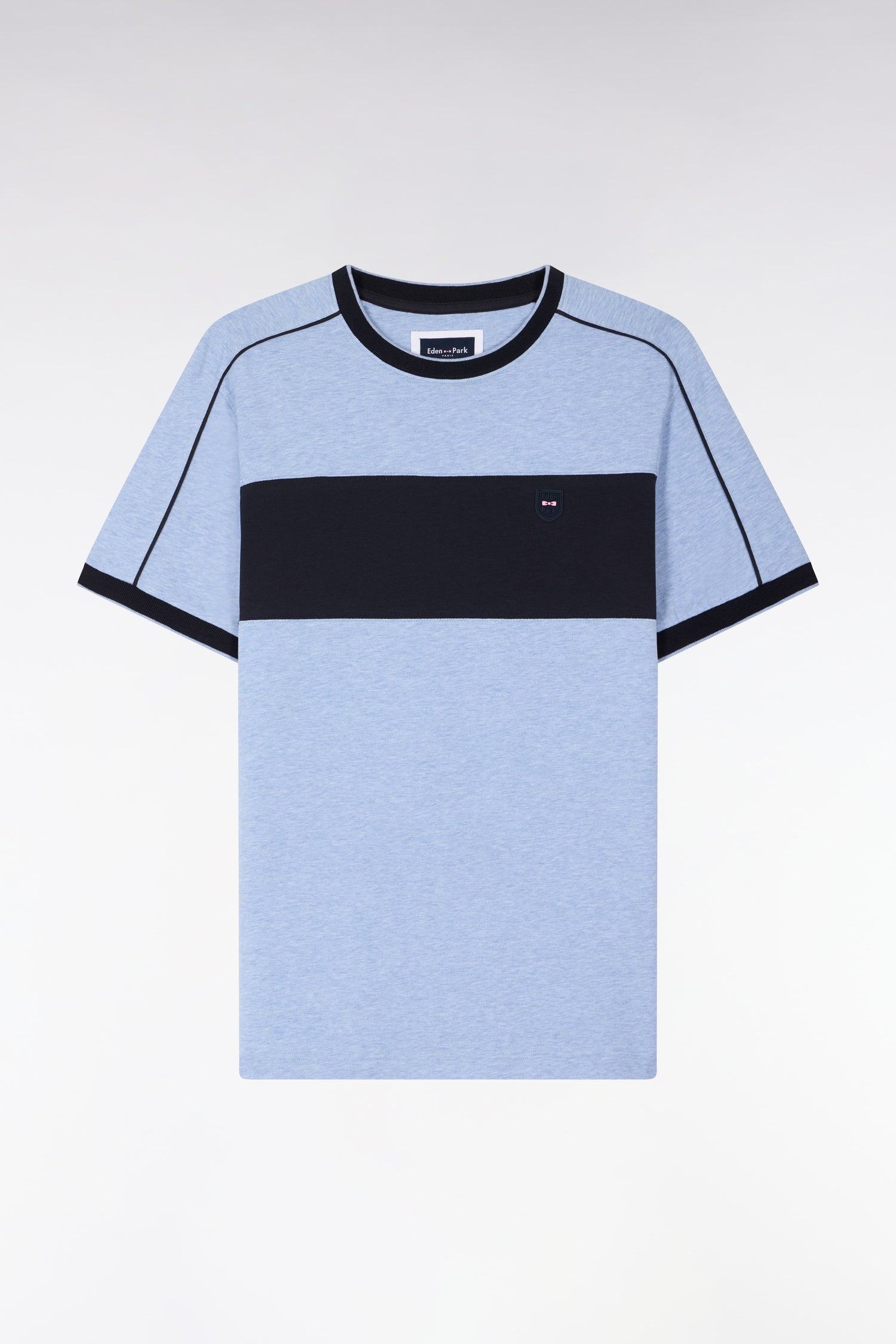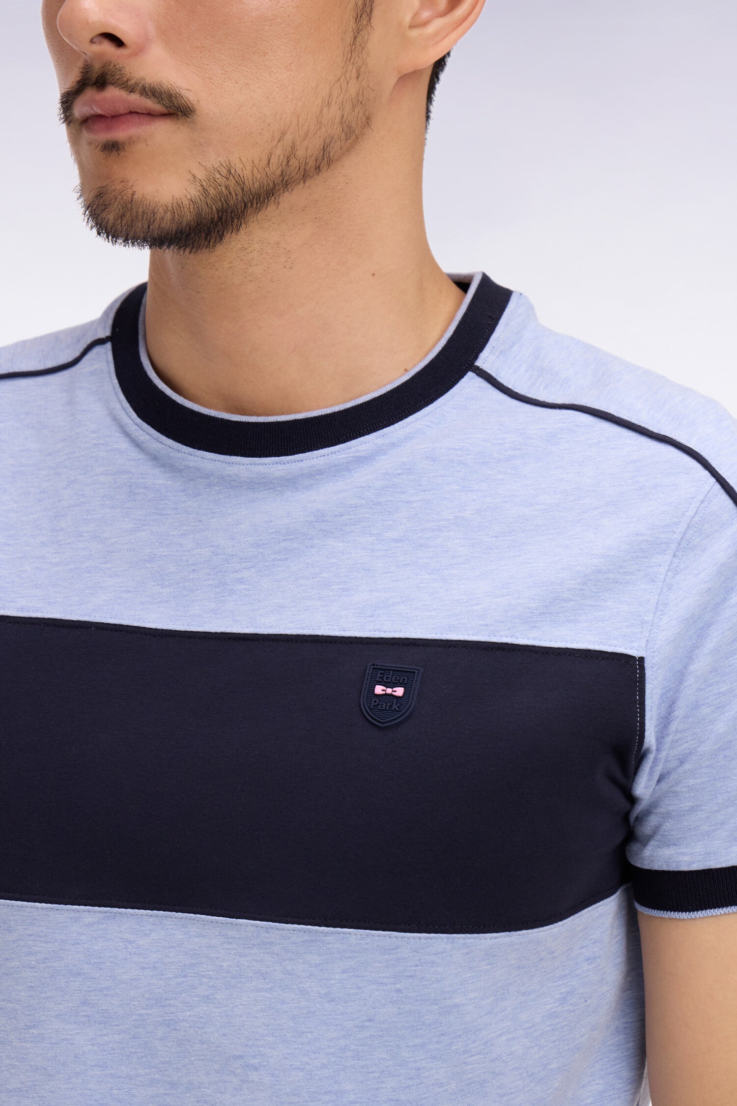Notre T-shirt à manches courtes bicolore présente un écusson nœud papillon, un détail qui s'ajoute à ses découpes et passepoils choisis dans nos codes couleurs emblématiques. Avec sa silhouette athlétique retravaillée et sa coupe légèrement ajustée, ce T-shirt en coton stretch présente des bords-côtes assurant votre confort et sa tenue, saison après saison.