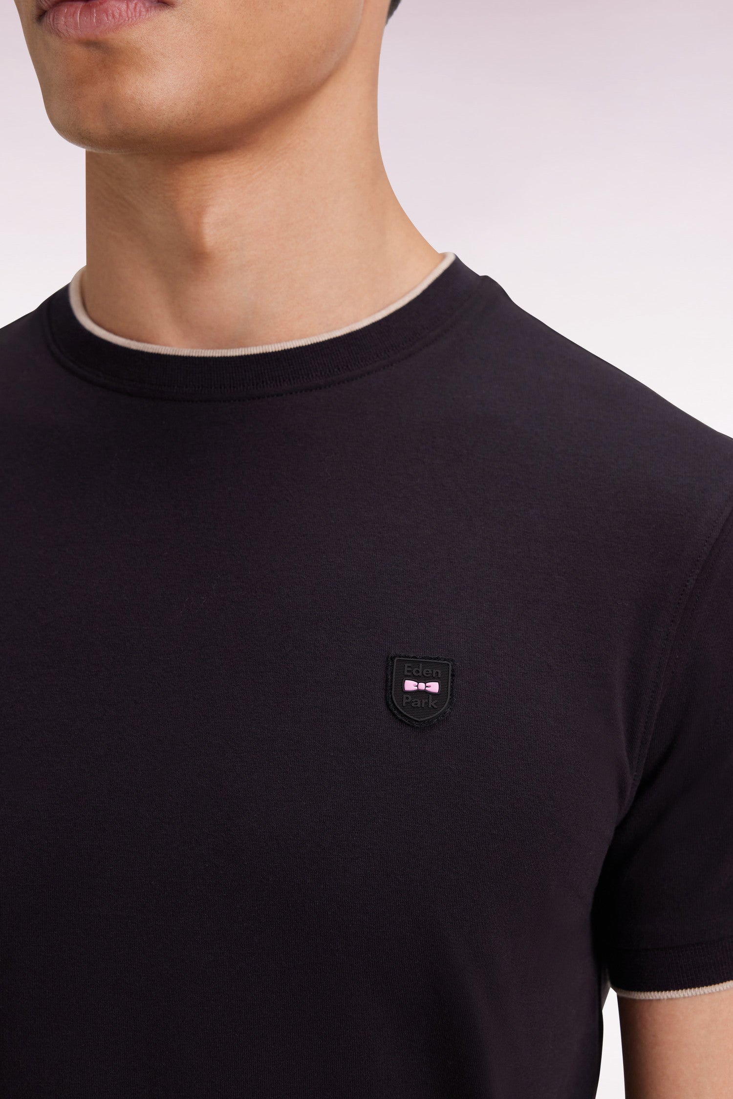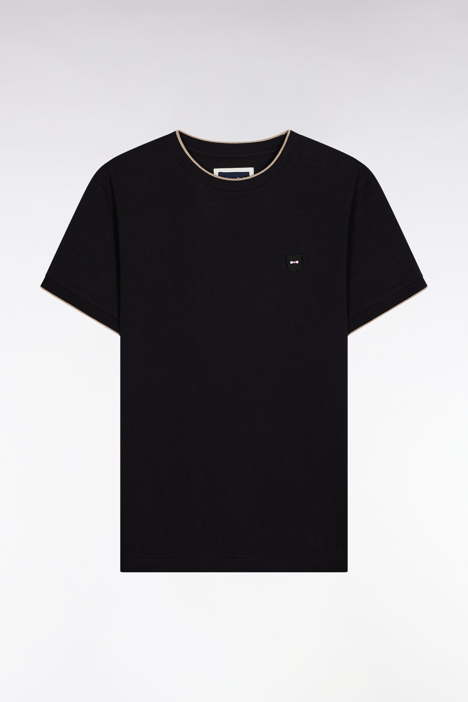 This stretch cotton jersey T-shirt is embellished with fine contrasting stripes right on the ribbed edges of the collar and sleeves for a discreet graphic touch. An essential revisited with subtlety in a slim-fit cut to slip into any wardrobe.