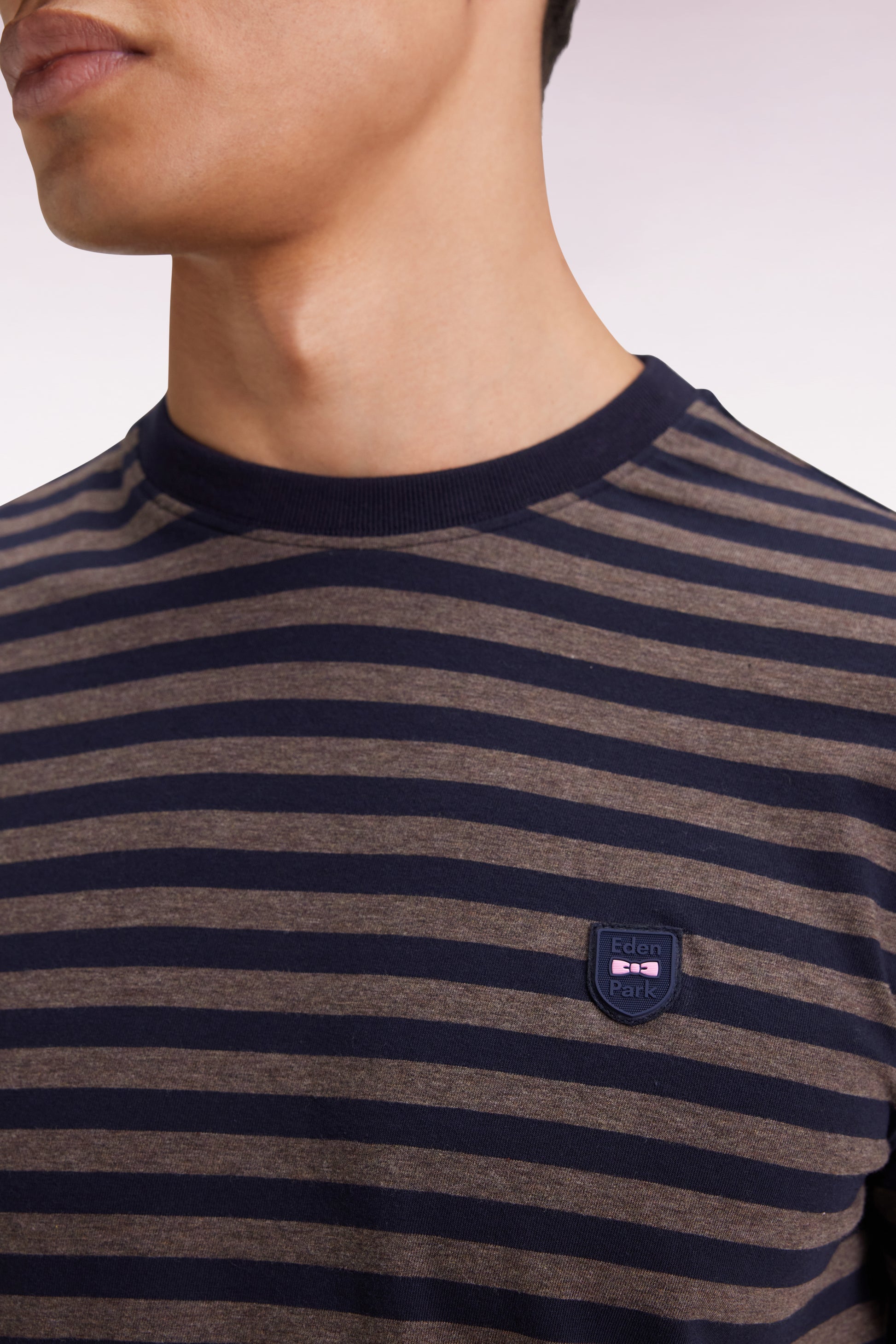 Designed to move with fluidity, this T-shirt in stretch cotton jersey revisits a men's wardrobe essential in a refined, athletic version with horizontal stripes. Its slim, fitted cut emphasizes the silhouette without constricting it, while its round collar with contrasting ribbing ensures a long-lasting fit. A modern essential featuring our signature crest