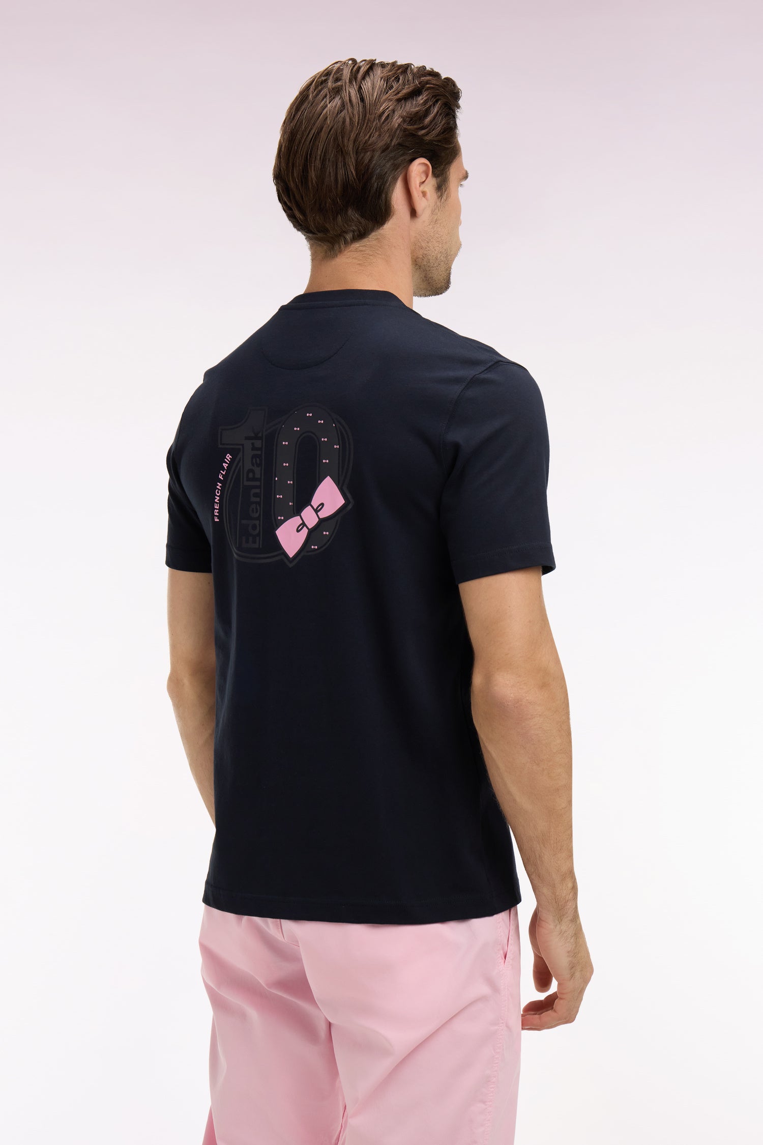 This short-sleeved T-shirt is distinguished by an exclusive screen print on the back, enhanced by an application of printed tie fabric. This signature detail brings relief and character to this deliberately refined piece on the front. A model designed to affirm DNA Eden Park with elegance and modernity, from its subtle emblem embroidery to its round collar with ribbed finishes.