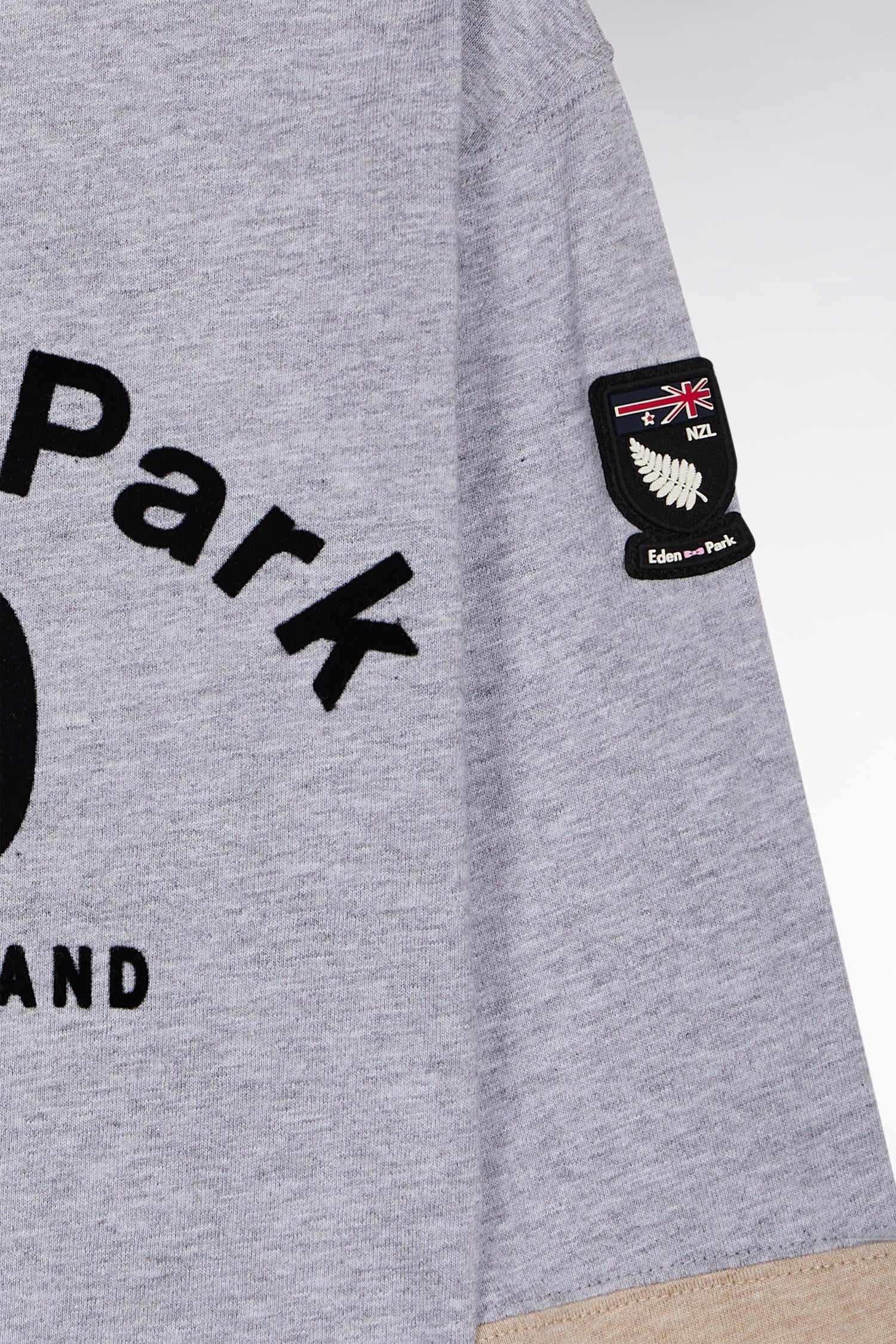 This long-sleeved cotton T-shirt is designed as a real style game for youngsters. Camel sleeves contrast with the gray body for a dynamic layering effect. A velvet-effect Eden Park tribute to New Zealand logo enlivens the front, while a New Zealand badge graces the sleeve.