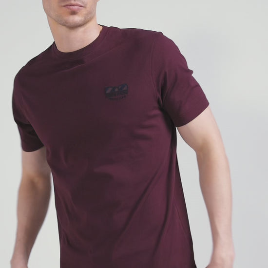 Regular burgundy short-sleeved cotton T-shirt with tie patchwork emblem