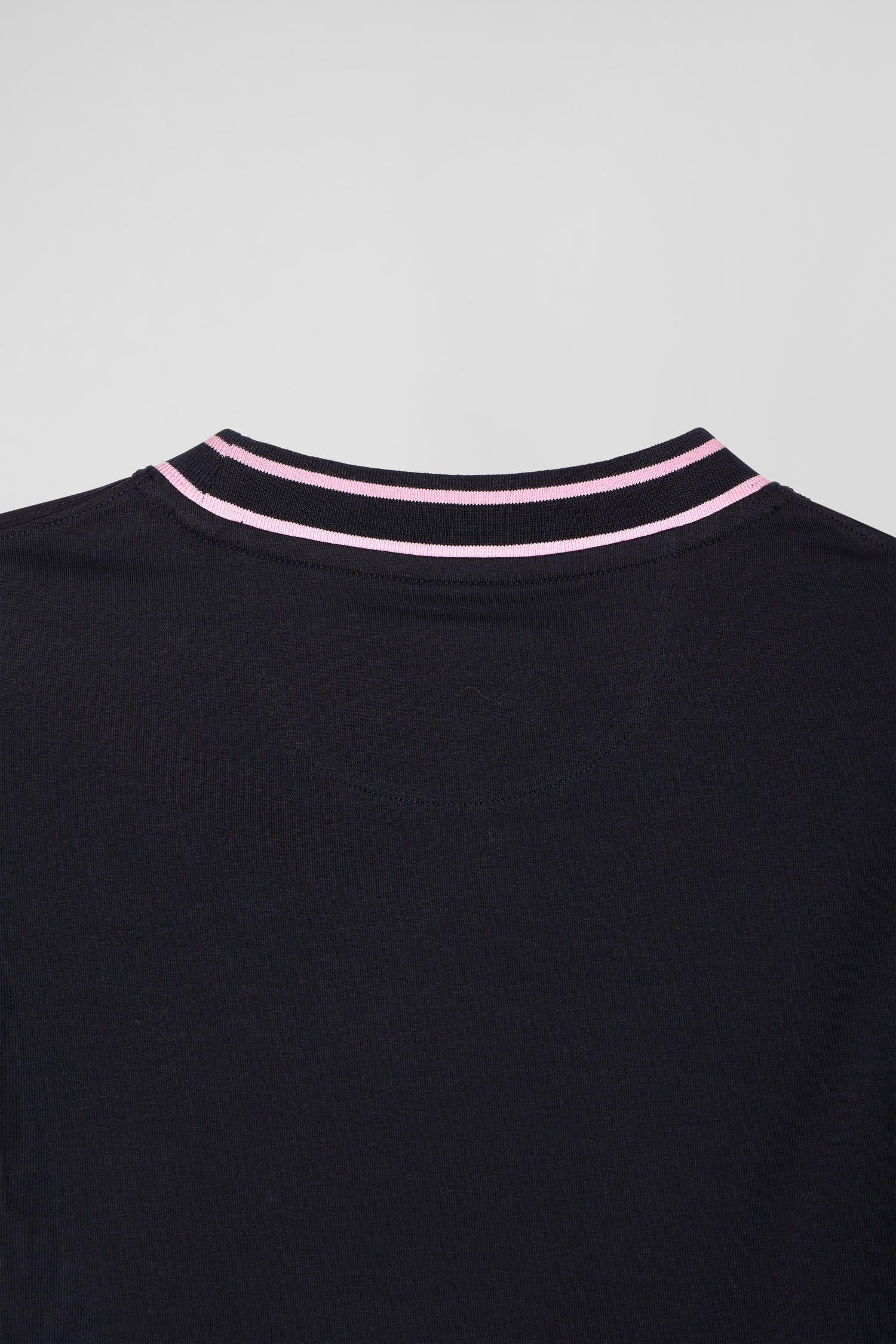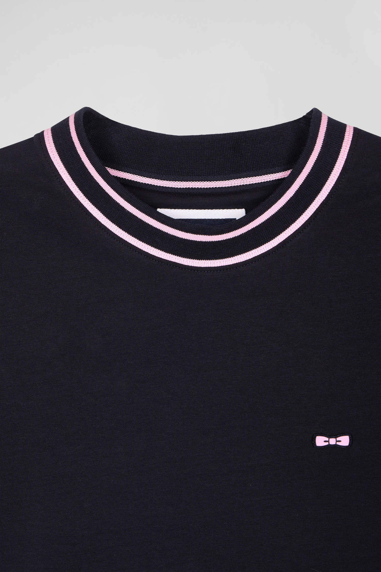 For a sporty look, this cotton jersey T-shirt features striped ribbed trims on the short sleeves, embossed with our House name. The contrasting round collar and pink bow-tie embroidery on the chest add an elegant touch.