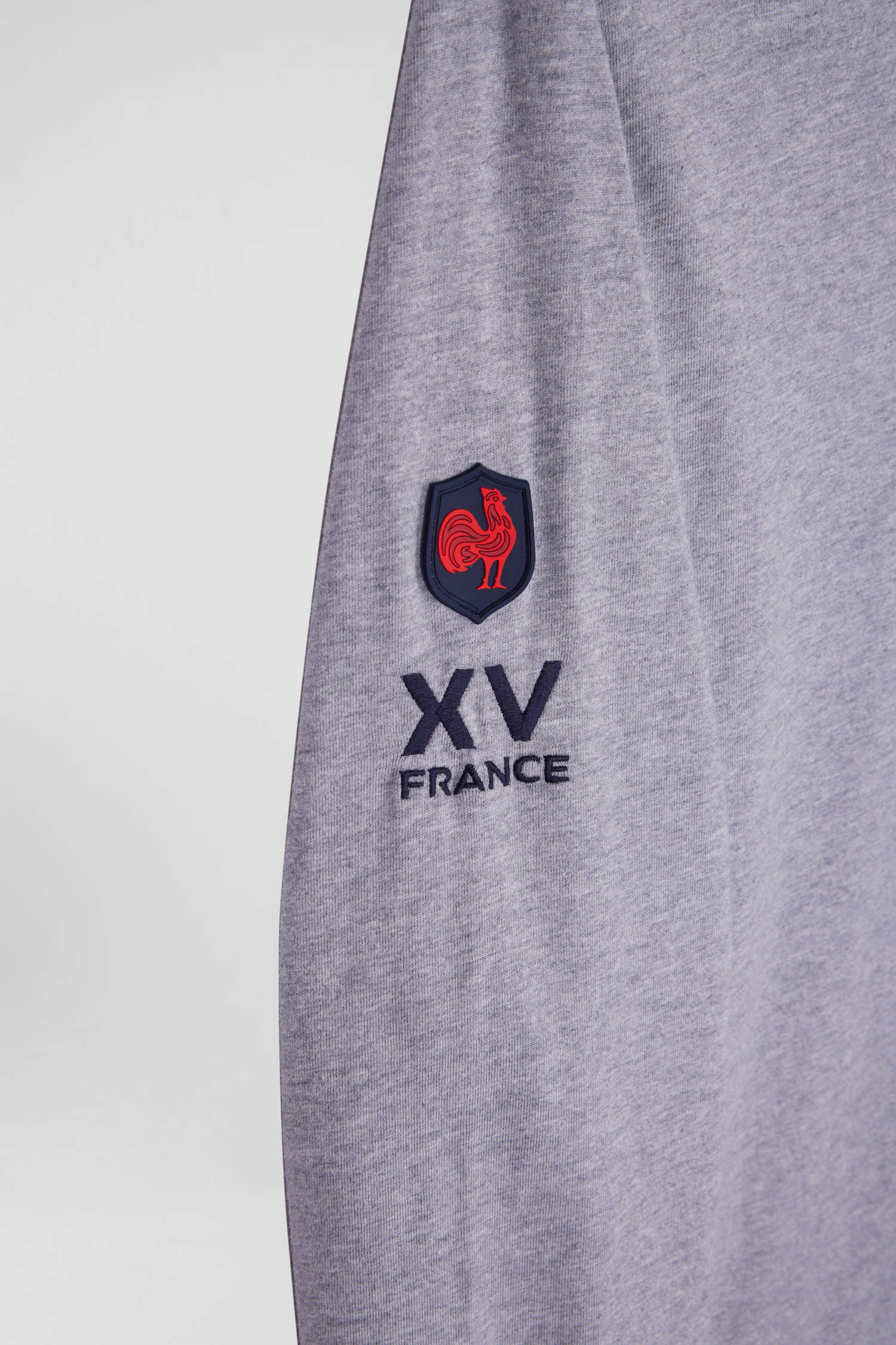 In symbiosis with the XV de France, Eden Park designs garments that reflect the spirit of rugby, combining elegance and functionality for everyday wear. This gray cotton jersey T-shirt features a tri-color ribbed collar, and is proudly embroidered with the French cockerel on the back.