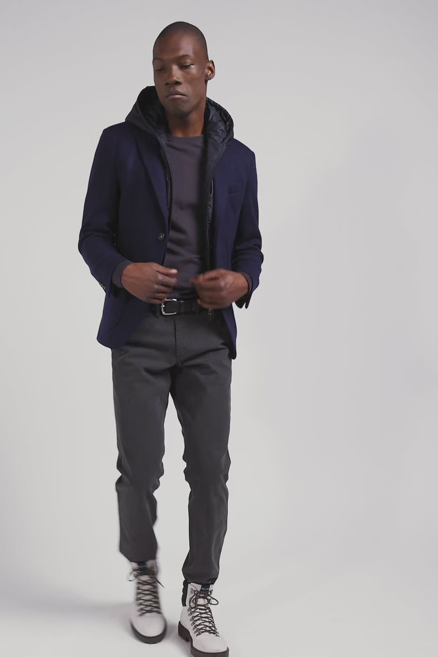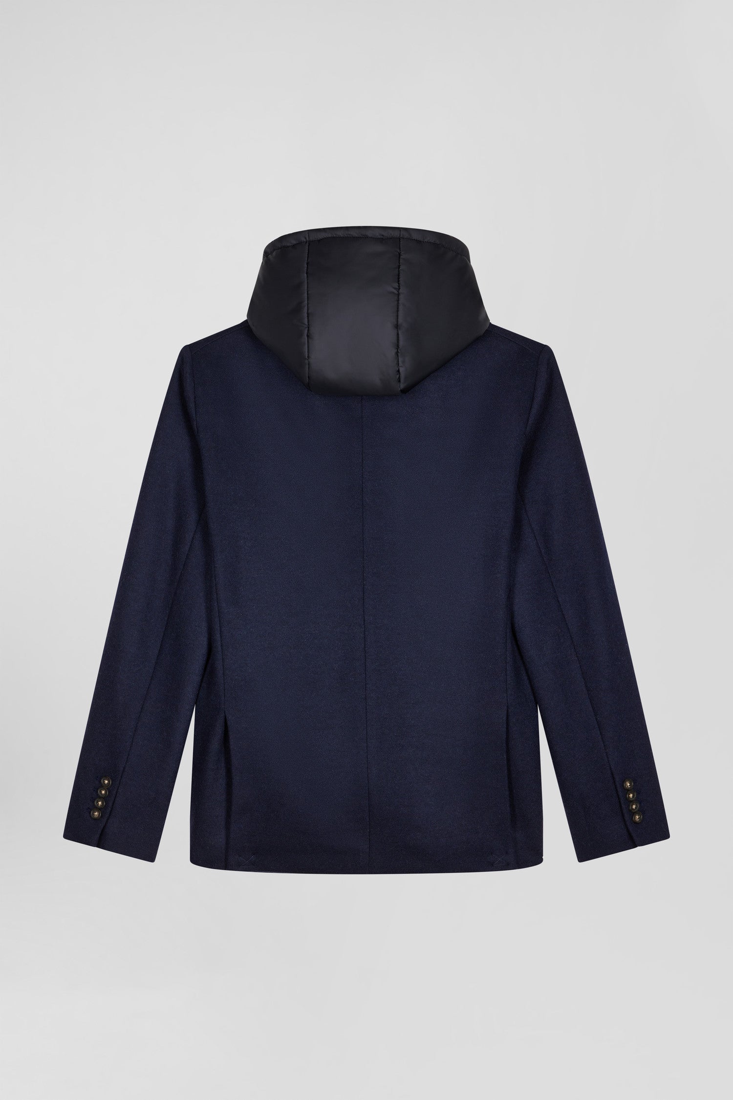 Our modern, versatile blazer is crafted in plain, double-faced jersey. This masculine two-button blazer features two slits at the back, offering excellent freedom of movement. A nylon trim with removable hood adds a practical contemporary touch. With two outside patch pockets, an asymmetrical chest pocket and two inside pockets, this blazer combines functionality and style. The slits at the bottom of the sleeves feature custom buttons, while the removable part can be detached with a custom zip, easily transforming this sporty-chic blazer to suit any occasion.